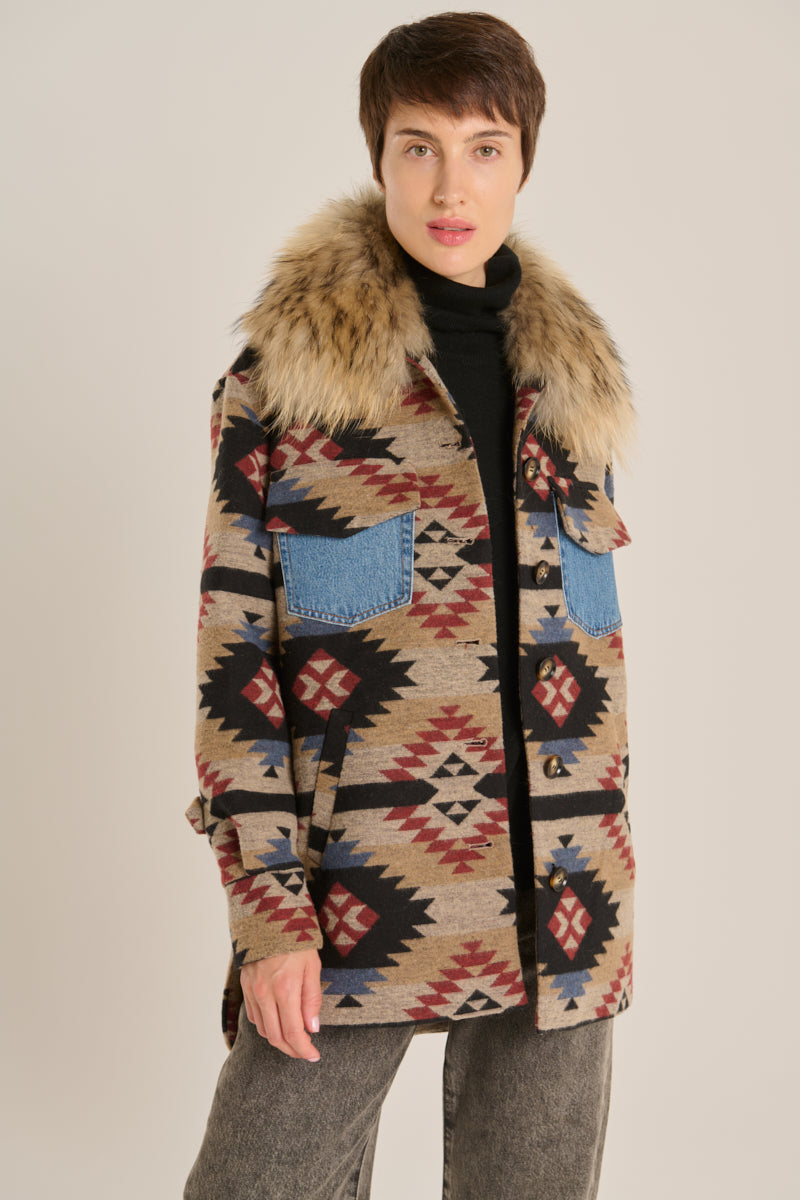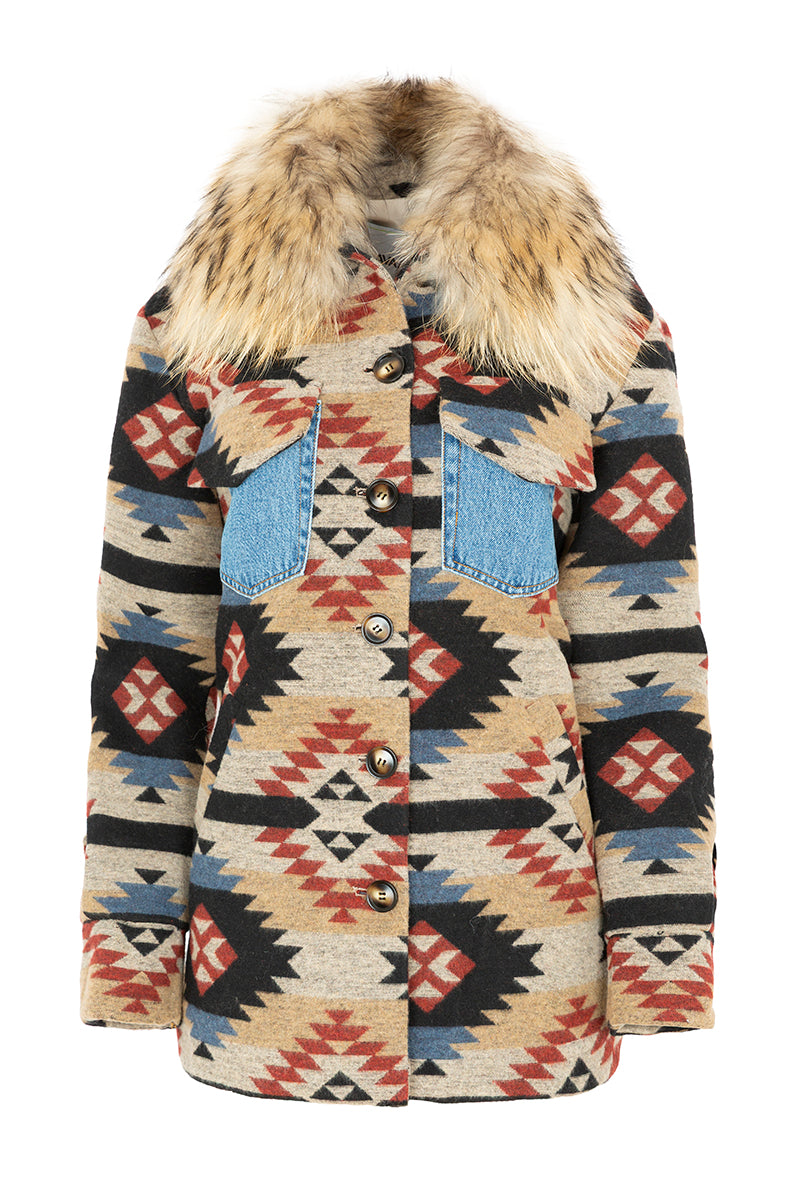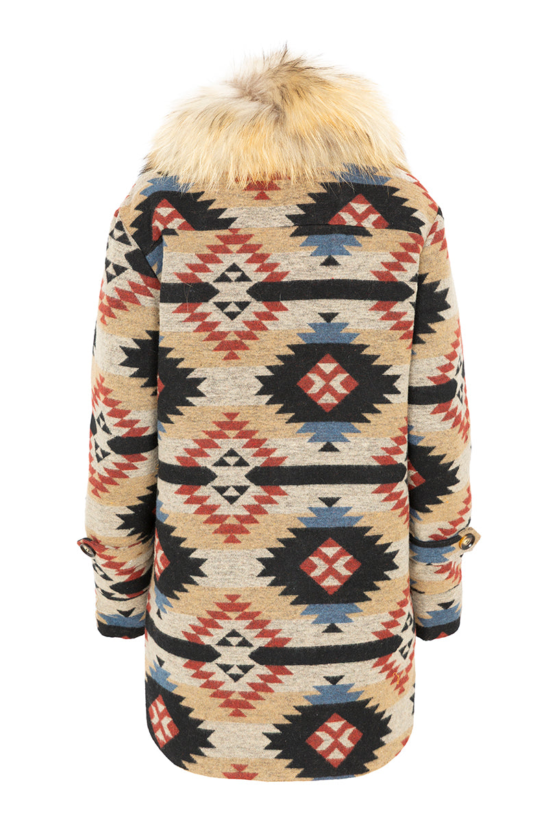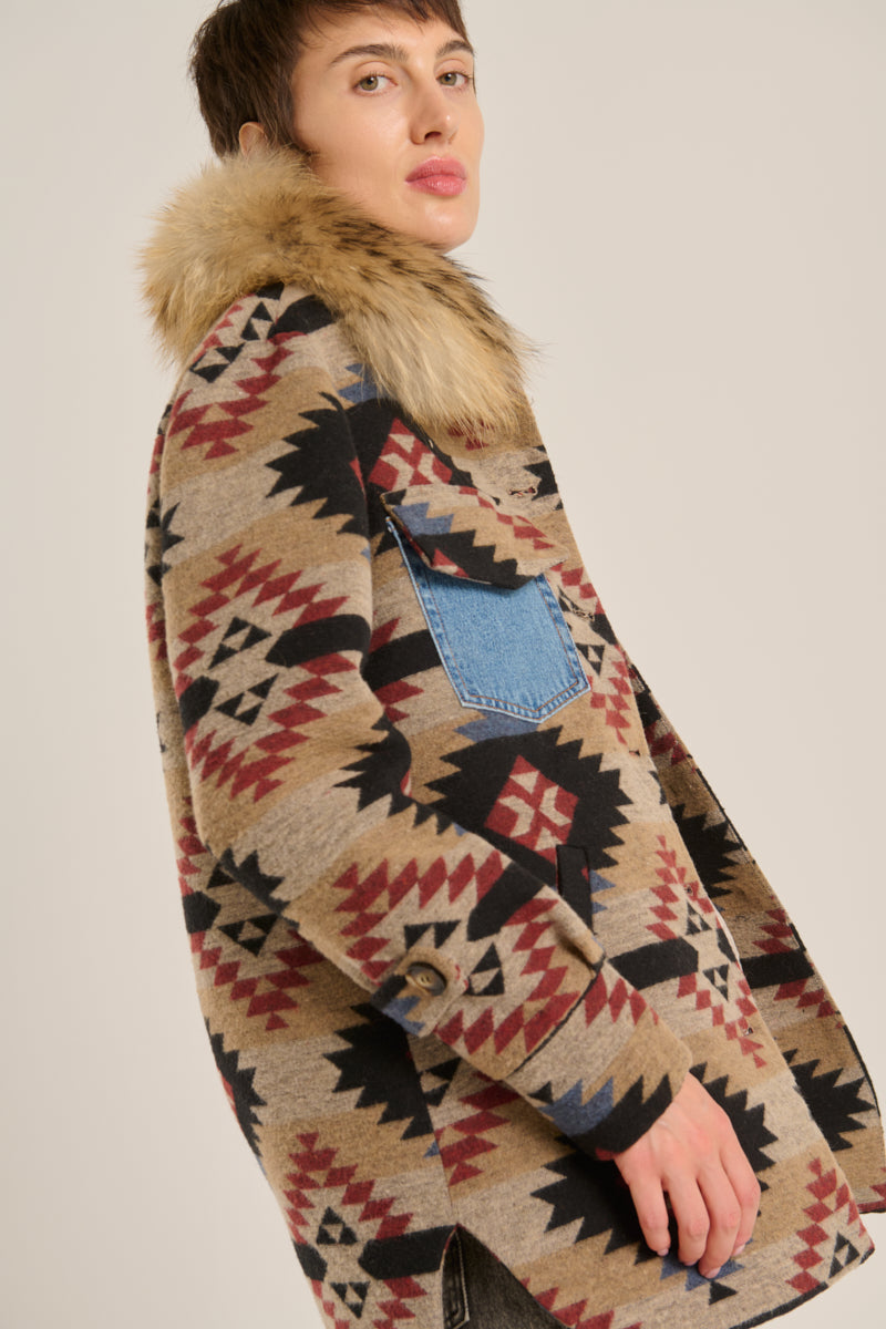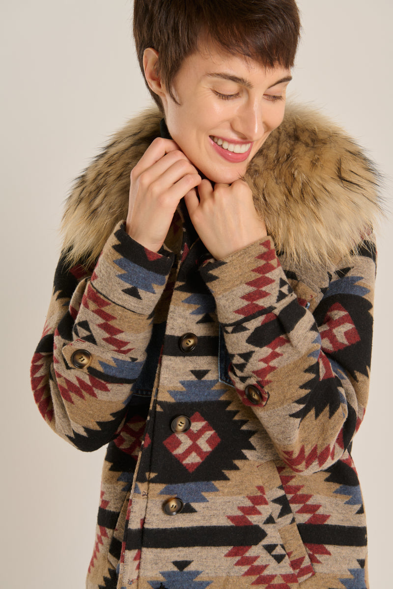 Abrigo de la firma Italiana Ava Adore. Corte militar con cuello de pelo, pequeñas aberturas laterales, bolsillos superiores de plastrón con tapeta en tejido denim, bolsillos inferiores tipo sastre y cierre de botón. Estampado azteca en tonos rojo, negro y azul sobre fondo beige. Composición: exterior, 10% lana, 90% poliéster, forro, 100% poliéster, cuello, 100% pelo de mapache . Hecho en Italia. Tallaje Italiano.