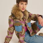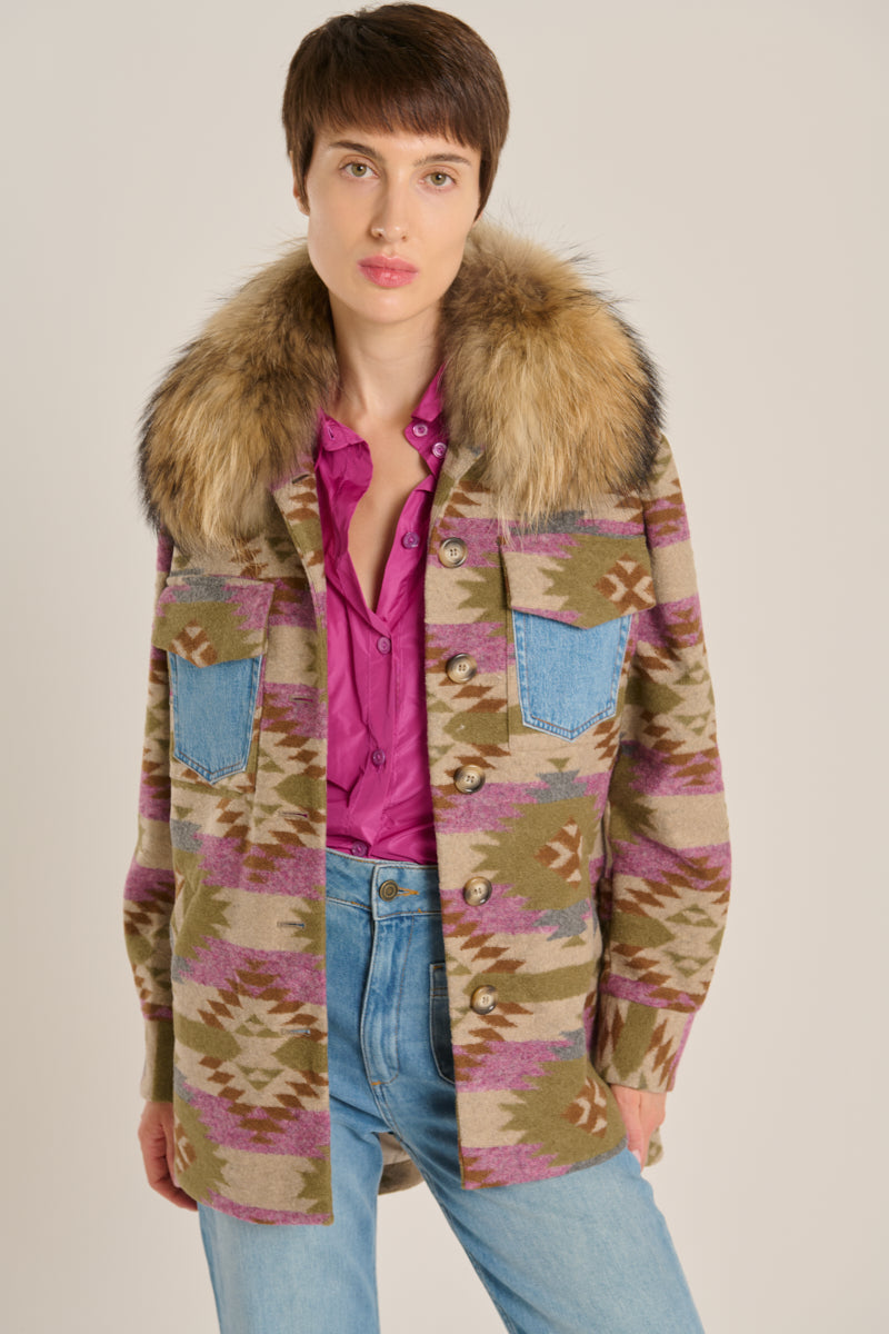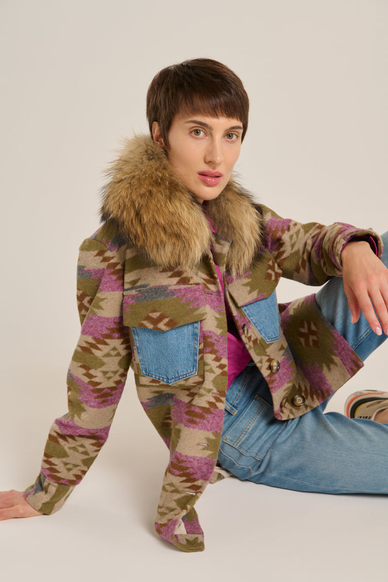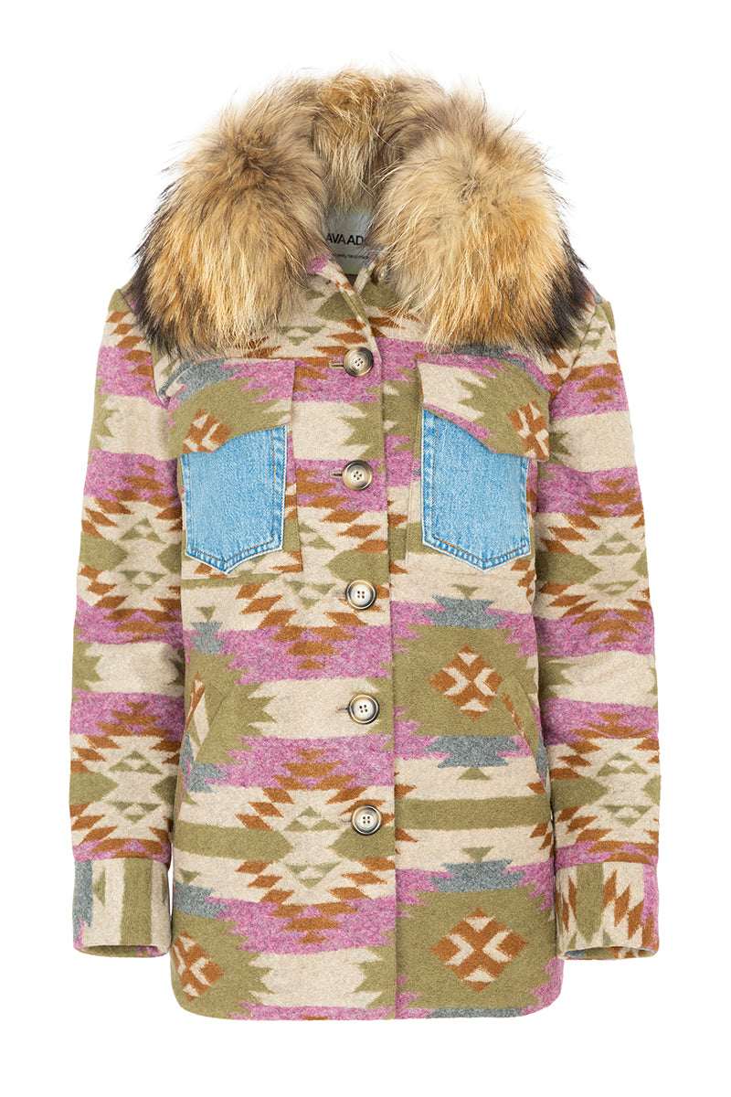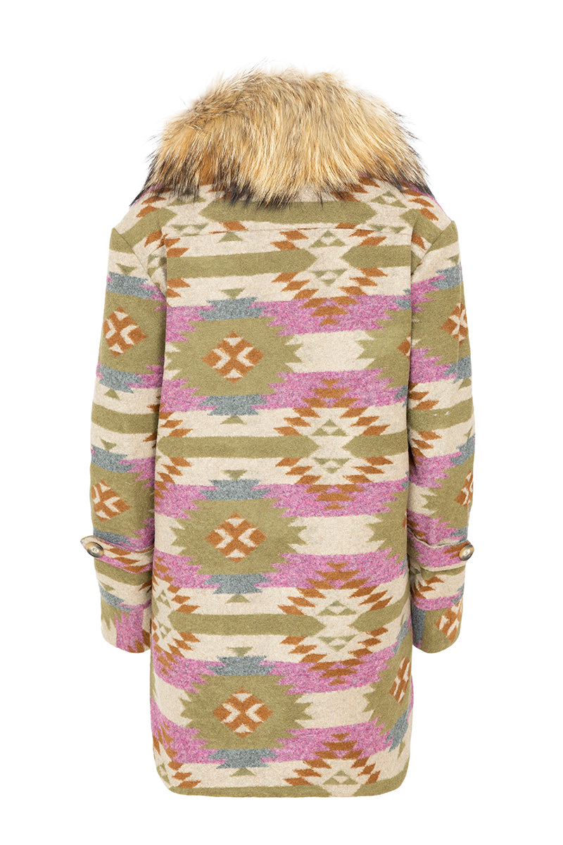 Abrigo de la firma italiana Ava Adore. Corte militar con cuello de pelo, pequeñas aberturas laterales, bolsillos superiores de plastrón con tapeta en tejido denim, bolsillos inferiores tipo sastre y cierre de botón.Estampado azteca en tonos verde, purpura, marrón sobre fondo beige. Composición: exterior, 10% lana, 90% poliéster, forro, 100% poliéster , cuello, 100% de pelo de mapache. Tallaje italiano.