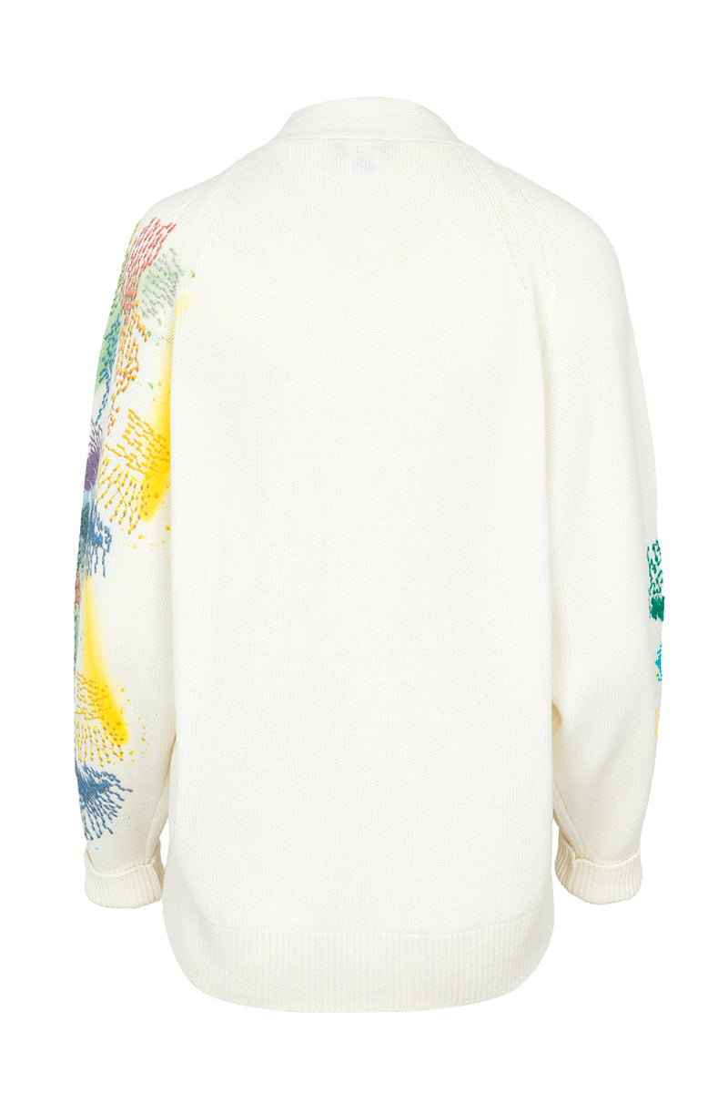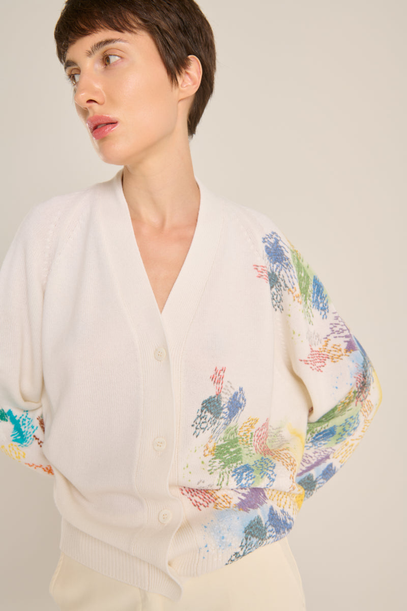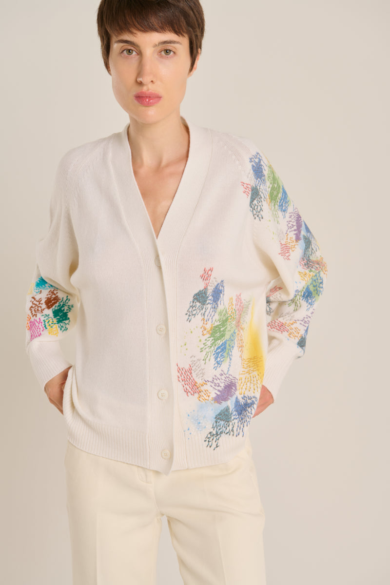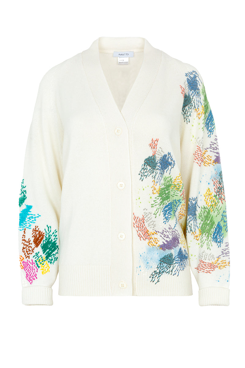 Cardigan de la firma italiana Avant Toi en cashmere. Bordado multicolor sobre fondo crema en frontal y mangas. Escote cuello pico. Cierre frontal con botones. Composición: 100% cashmere. Hecho en Italia. Tallaje italiano.