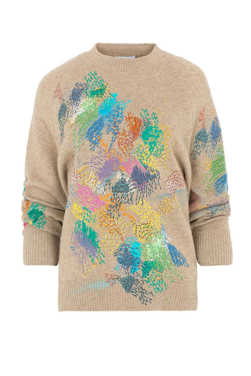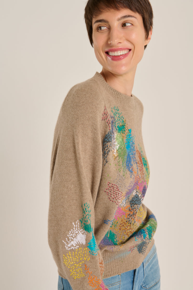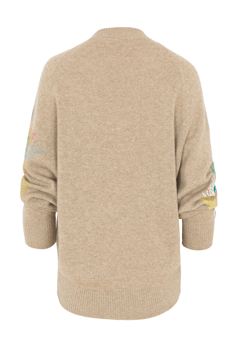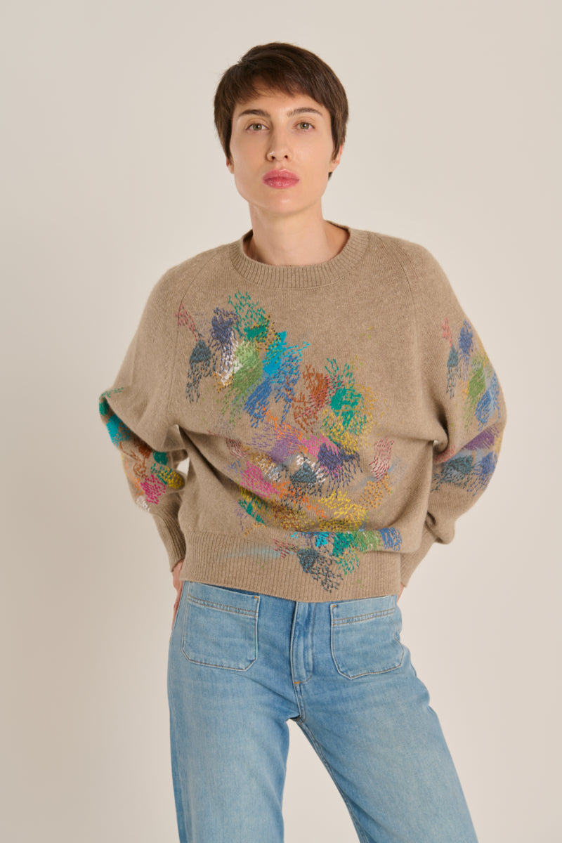 Jersey de cashmere de la firma italiana Avant Toi. Bordado multicolor sobre fondo tostado en frontal y mangas. Cuello a la caja. Composición: 100% Cashmere. Hecho en Italia. Tallaje Italiano.