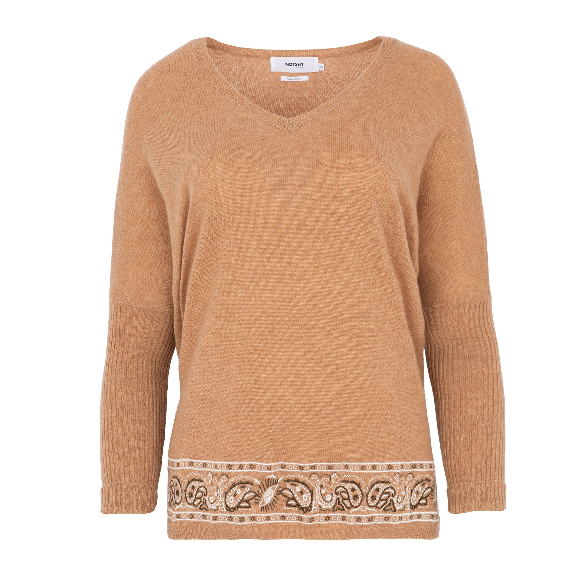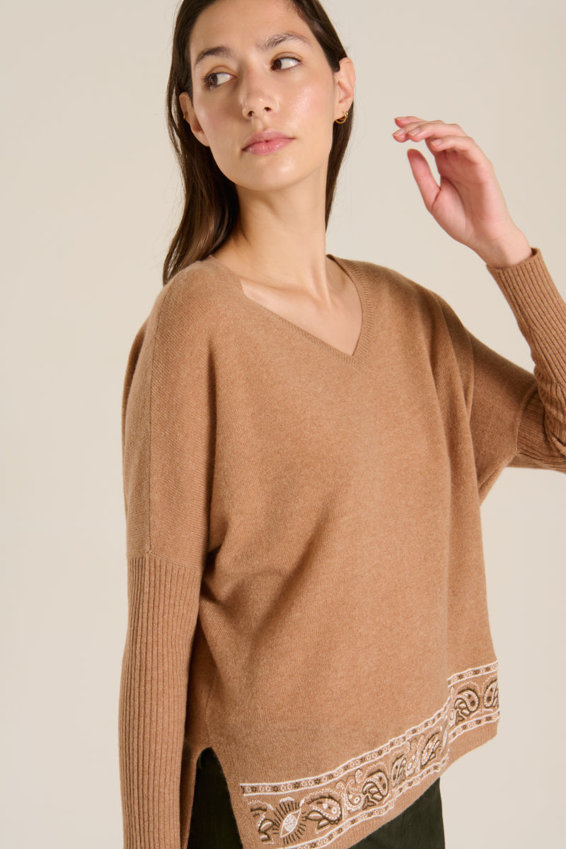 Jersey de cuello pico de la firma francesa Not Shy en color camel. Cenefa bordada con motivos arabescos en tonos verde oscuro y blanco. Composición: 100% Cachemire.