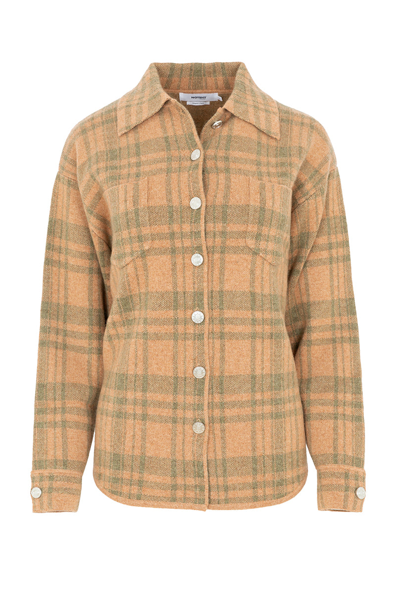 Chaqueta de punto de cashmere, de la firma francesa Not Shy, estilo cowboy . Cuello y puños camiseros y cierre con botones metálicos clásicos de las prendas vaqueras. Bolsillos delanteros, bajo redondeado. Color camel con cuadros madras en verde salvia . Composición: 100% cashmere .