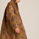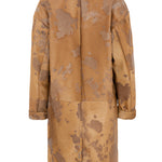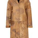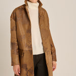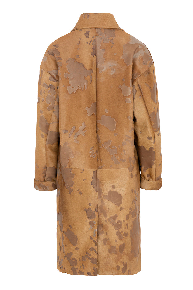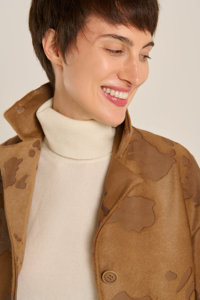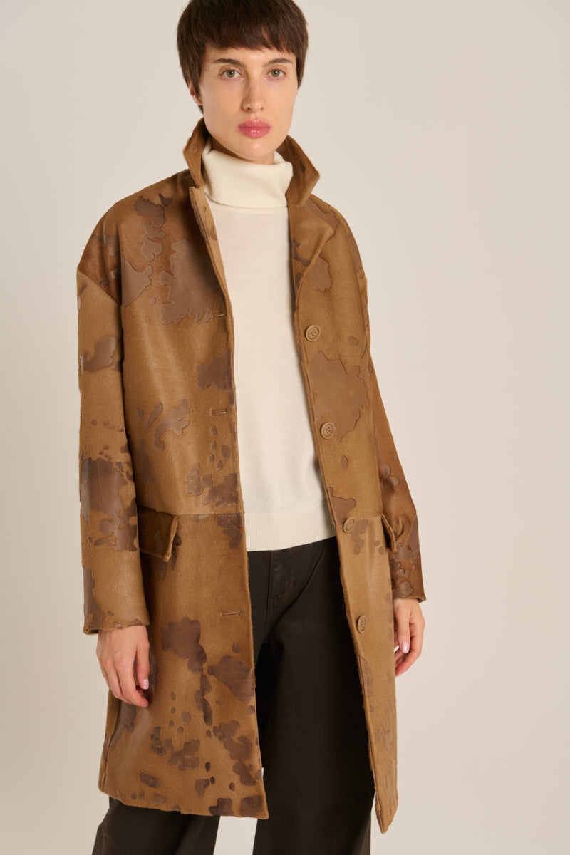 Chaqueta de la firma Italiana Salvatore Santoro, confeccionada en piel de cordero con detalles en relieve en tonos tierra y caramelo emulando la piel de potro, solapa de muesca, manga recta caída, abotonadura frontal, bolsillos de tapeta y costura en la parte media de la prenda. Composición: 100% piel de cordero.