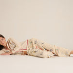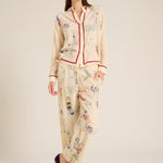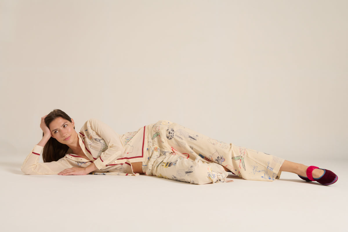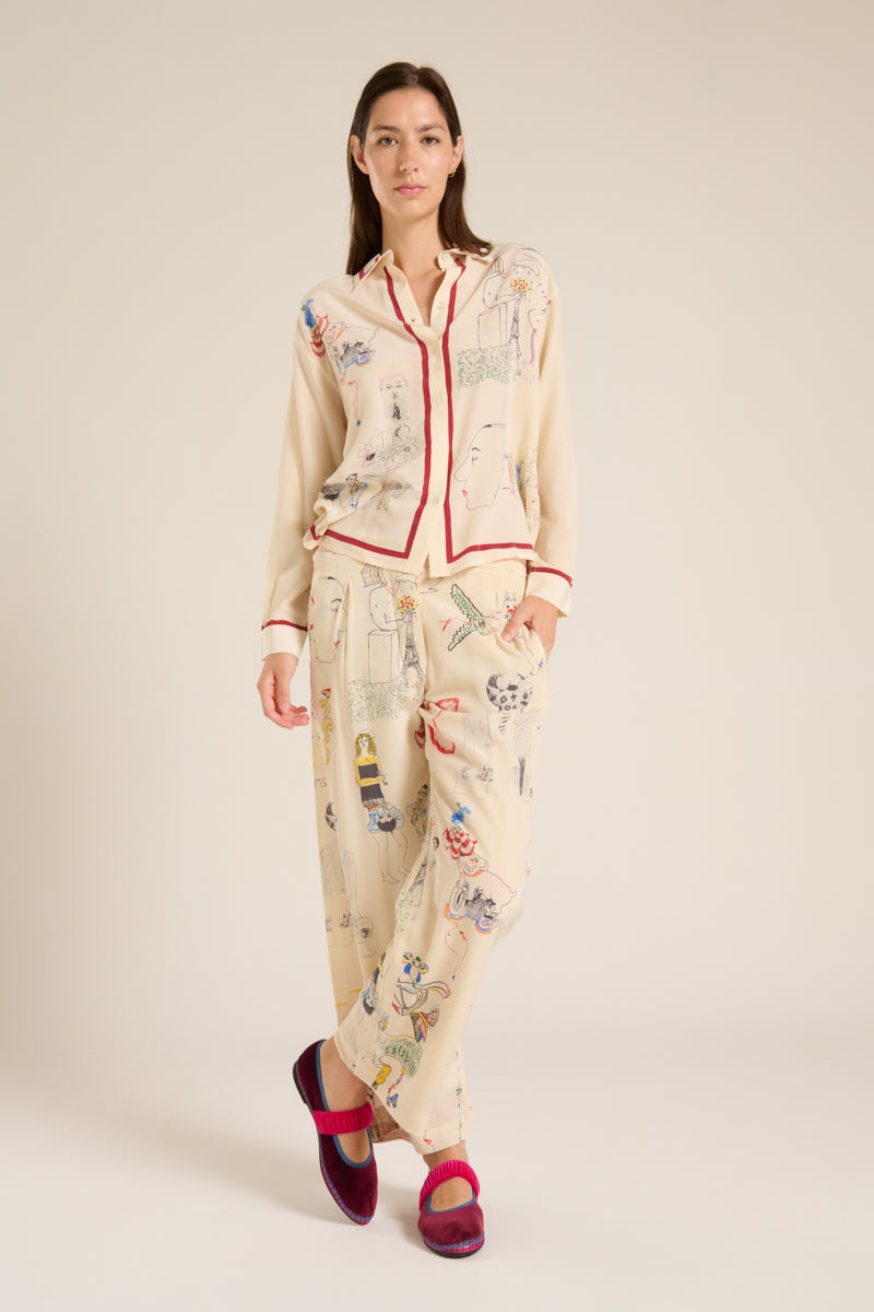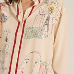 Camisa fluida de la marca Mii. Cuello camisero y manga larga. Estampado de dibujos del surrealismo en negro, azul , rojo, negro, amarillo sobre fondo crudo. Detalle en cuello, bajo y bordeando los botones en color mar sala . Composición : 100% seda