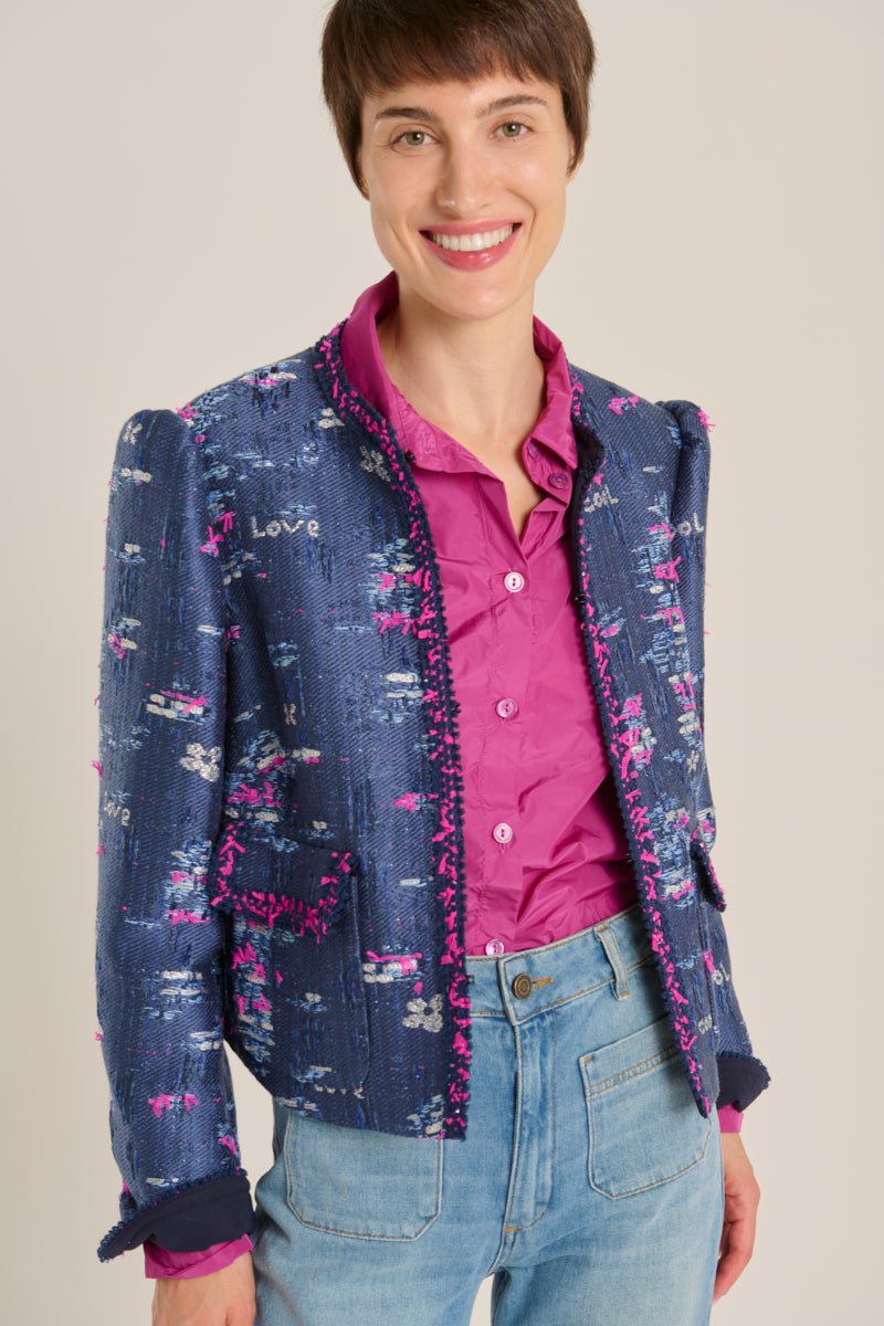 Chaqueta de la firma alemana Maison Common de tweed tipo chanel, con bordados en tonos fucsia y plata sobre fondo azul marino. Corte recto, hombros estructurados y ribeteado con aplicaciones de hilo en contraste. Bolsillos frontales y cierre con corchetes. Composición: 60% acetato 40% viscosa. Hecho en Alemania.