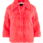 Chaqueta corta de visón, en color rosa. Cuello solapa , manga francesa, bolsillos laterales y cierre con ganchos peleteros . Posibilidad de recoger el bajo con cordones elásticos. Composición: 100% piel de visión.