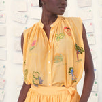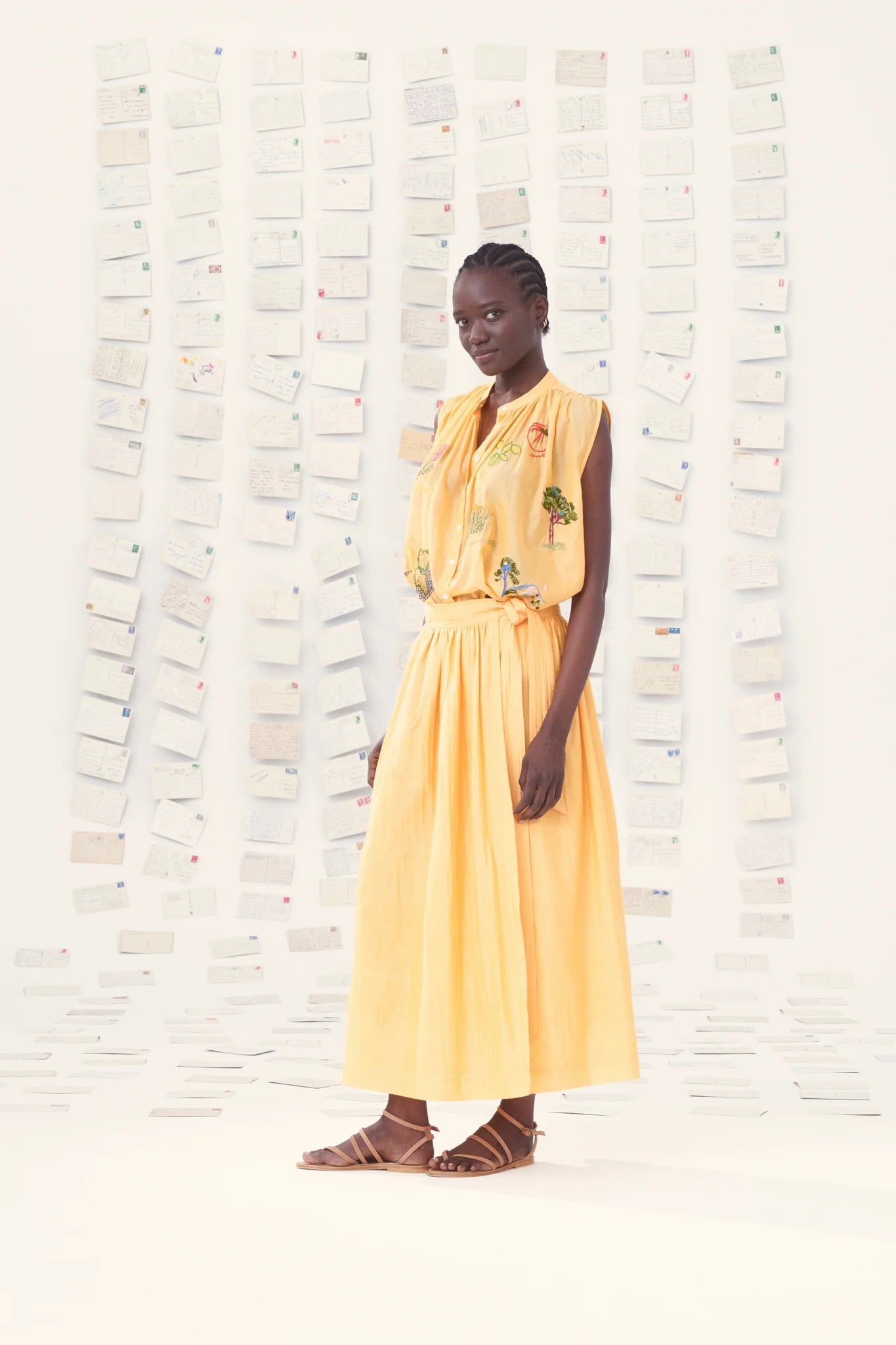 La camisa sin mangas Iris está confeccionada en una ligera mezcla de algodón y seda tejida a mano. Su tono albaricoque evoca la hermosa luz del verano. Hemos bordado a mano icónicos motivos provenzales: lavanda, jabón de Marsella, olivos, limones...