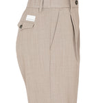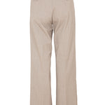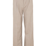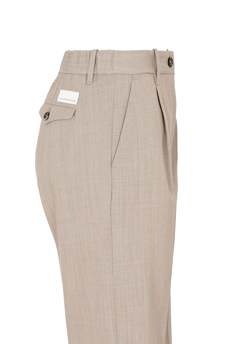 Pantalon de la firma Nine in the Morning, de tiro alto y corte de pierna recto. Dos bolsillos delanteros laterales y dos bolsillos traseros con cierre botón. Cinturilla con trabillas y goma elástica trasera. Color taupe claro. Composición: 53% Poliéster, 43% Lana virgen, 4% Elastano. Hecho en Italia. Tallaje italiano.