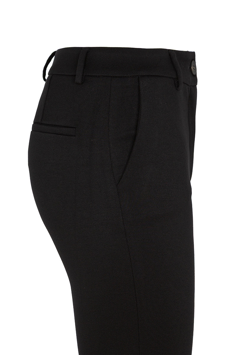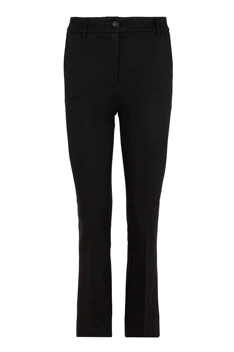 Pantalon de la marca italiana Vía Masini 80, en tejido candas, de tiro medio alto y ligeramente acampanado en color negro. Bolsillos laterales. Composición: 71% Viscosa, 25% Poliamide, 4% elastan. Hecho en Italia. Tallaje italiano.