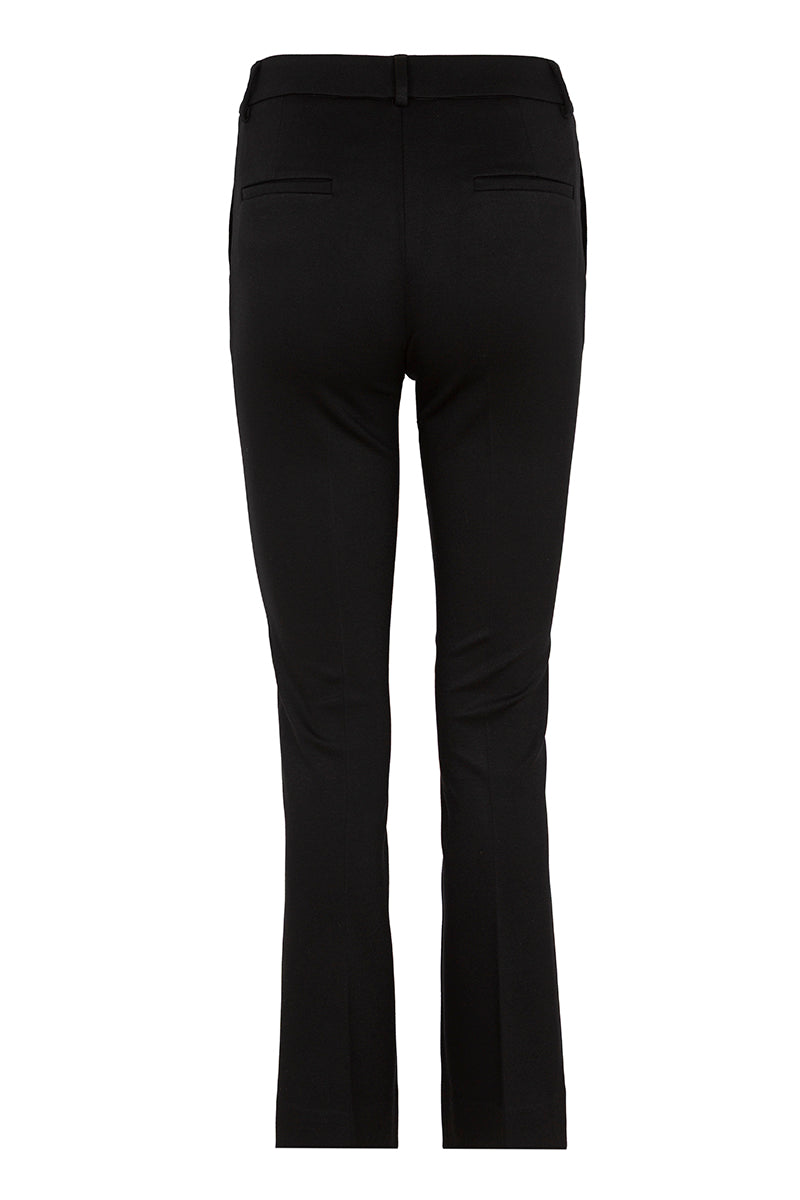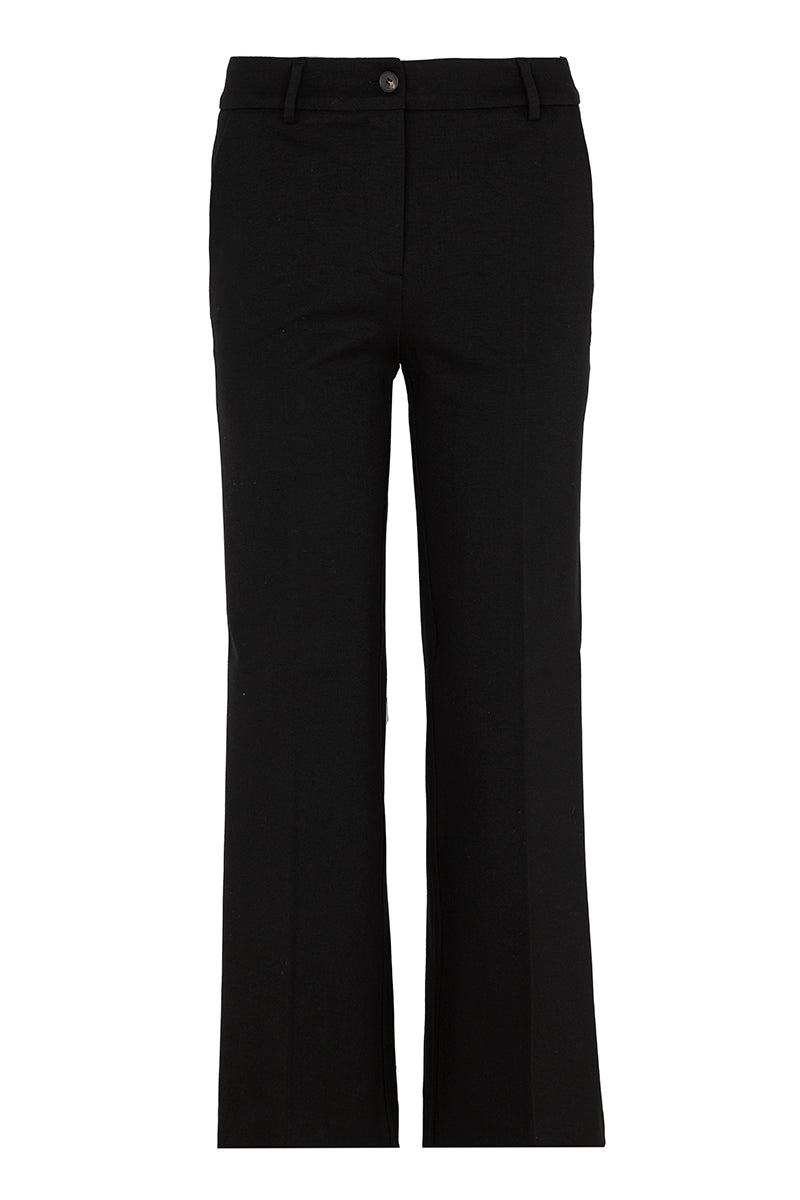 Pantalón de la marca italiana Via Masini 80, de tiro medio alto, corte recto, ancho y ligeramente acampanado. Color negro, con bolsillos laterales. Composición: 64% Viscosa, 31% Poliamide, 5% elastano. Tallaje italiano. Hecho en Italia.