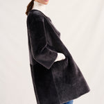 Abrigo de piel de cordero español. Manga francesa con cuello a la caja y reversible. Interior en napa color hoja seca y el exterior pelo tratado en color antracita. Botón clip de carey. 100% Cordero español.