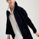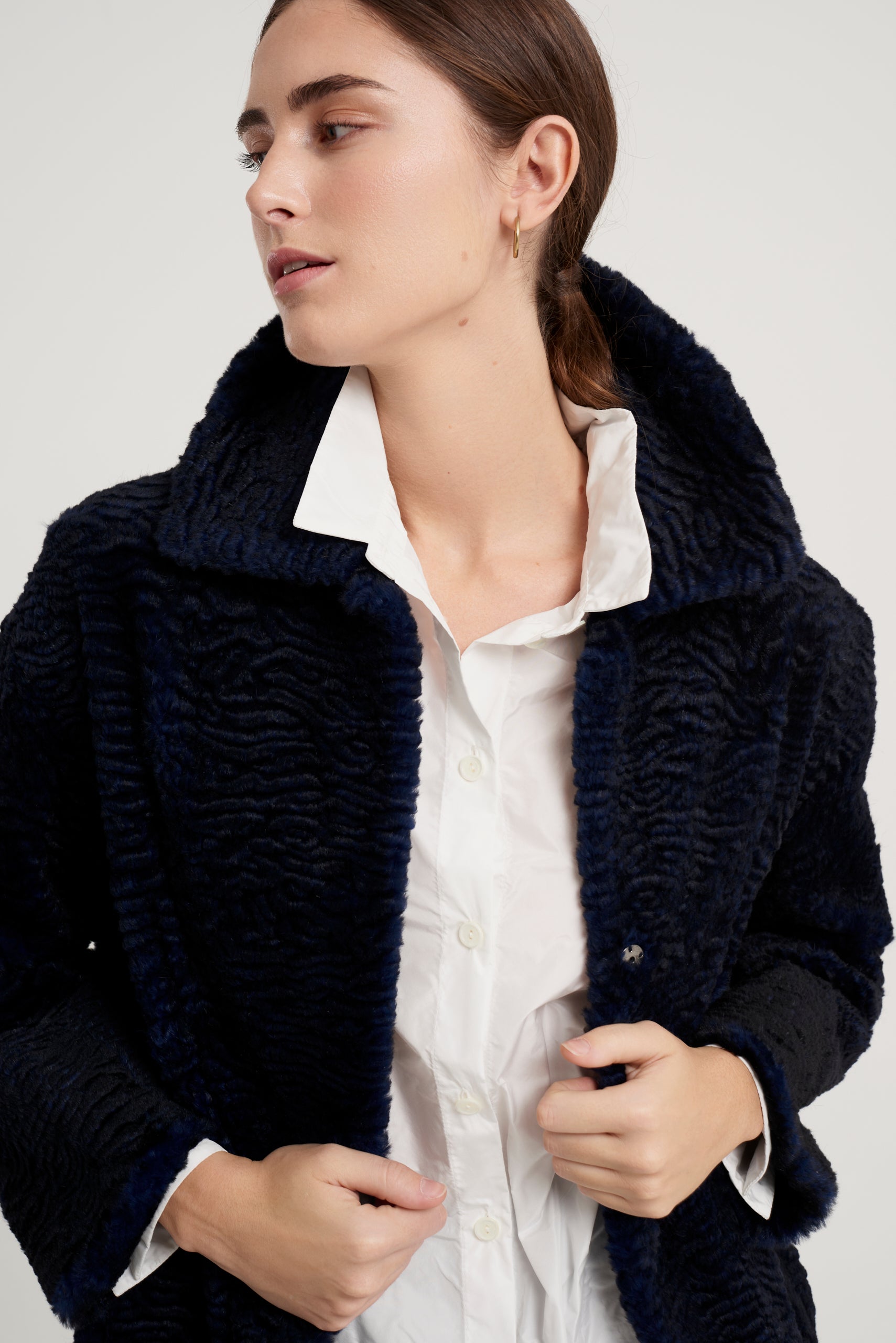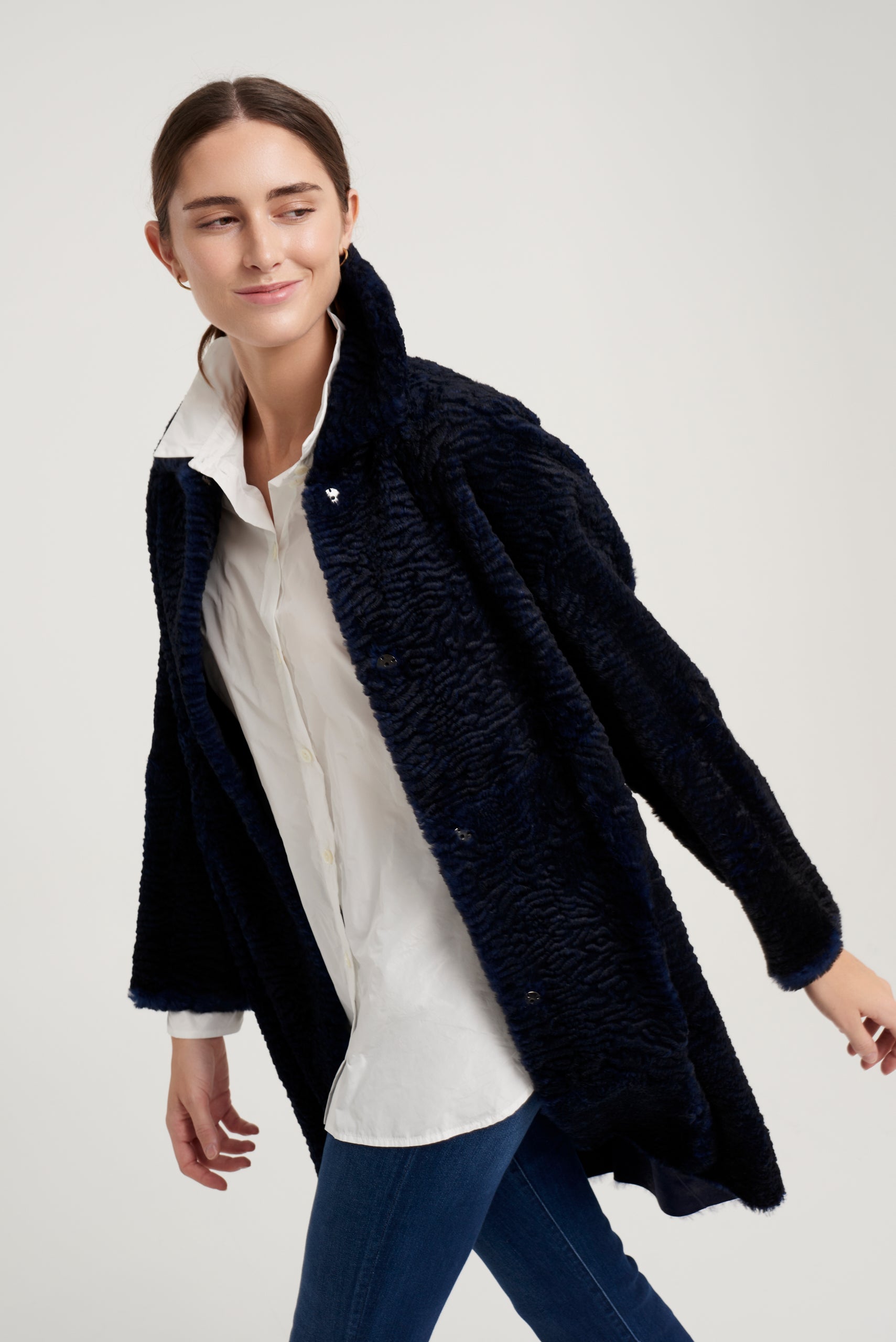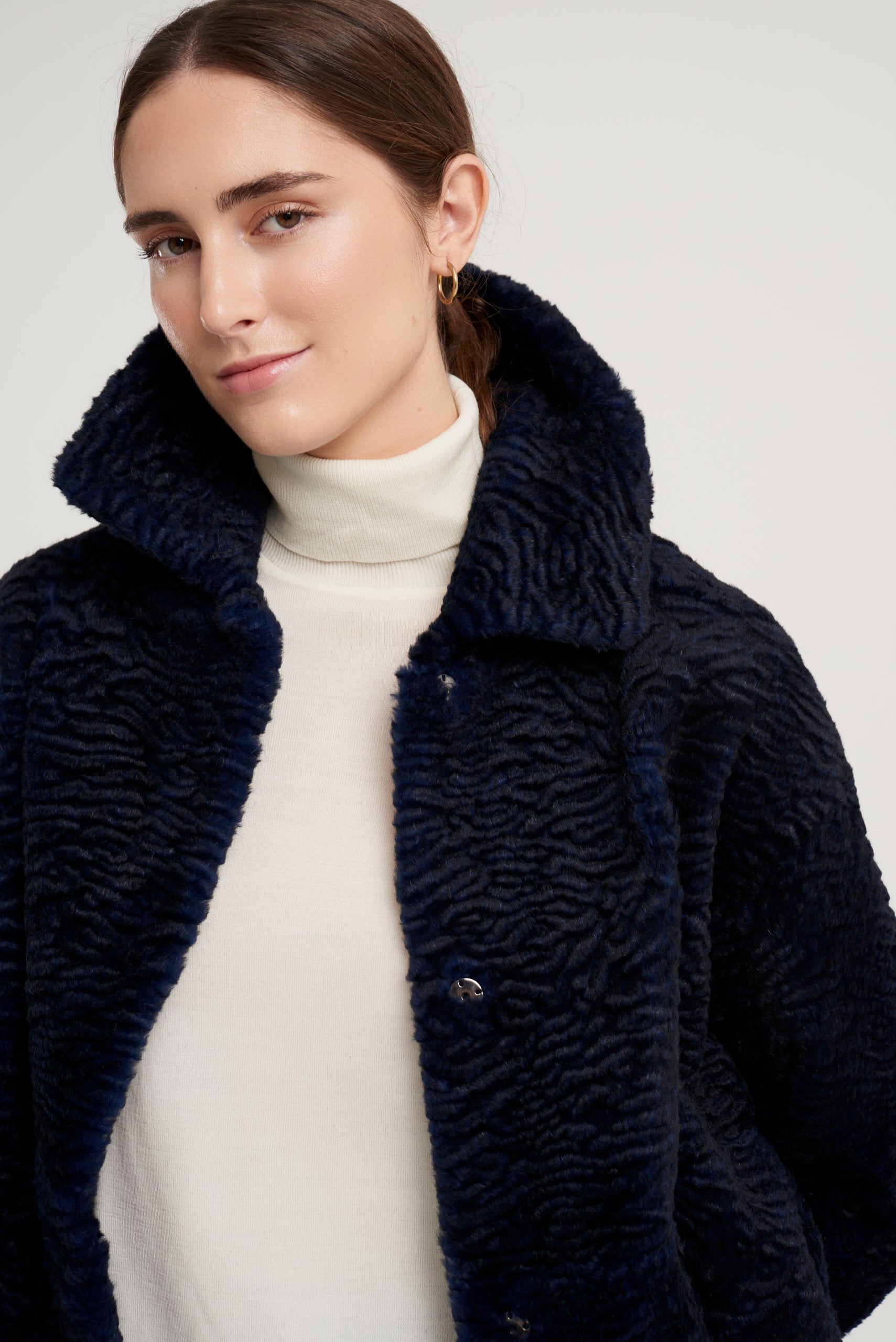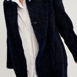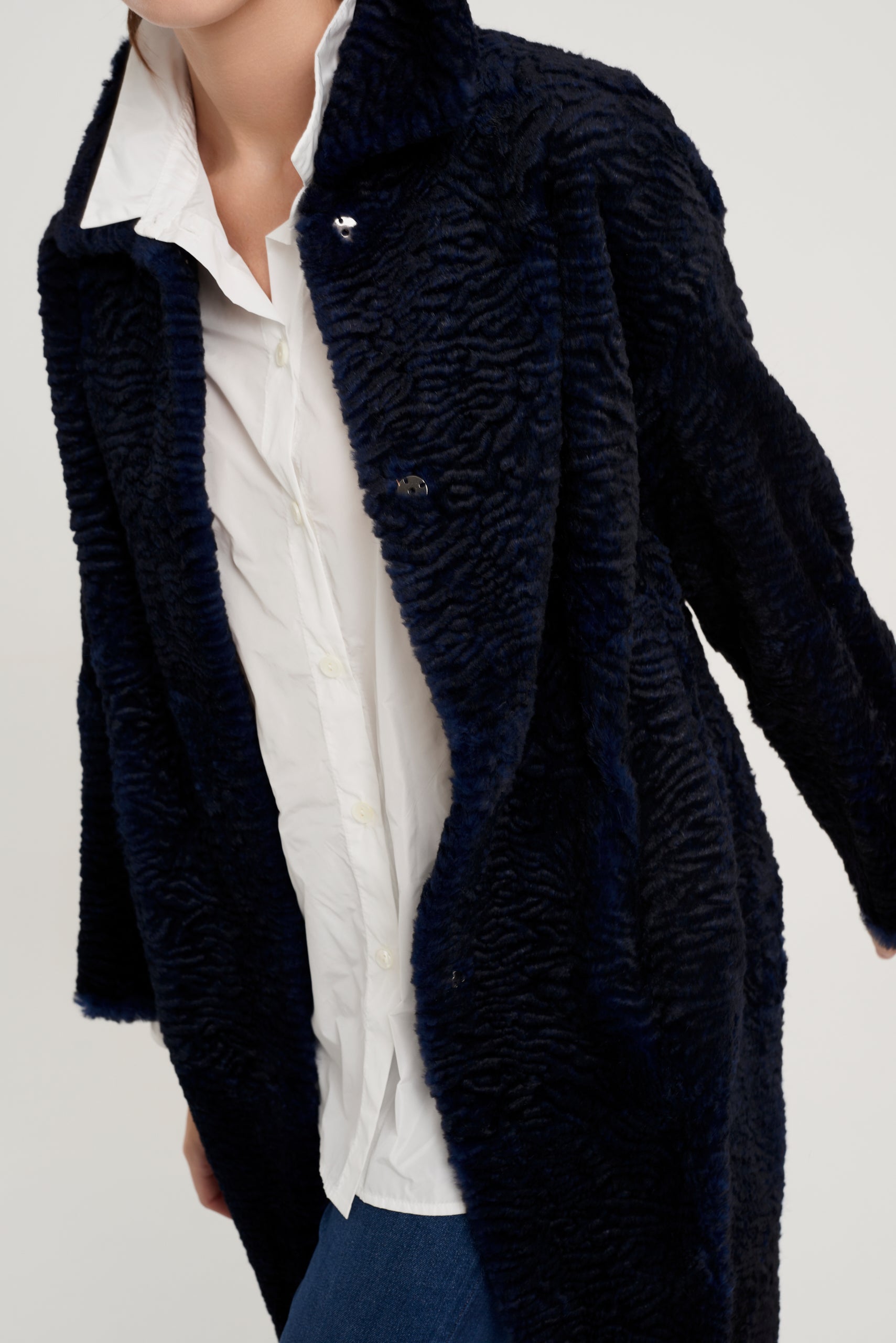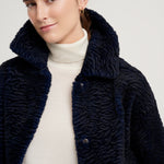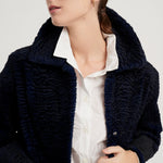 Abrigo modelo Kaia largo rodilla. Reversible en piel de lapin con efecto astrakanado en exterior y napa mate en interior. Manga caída. Cuello camisero. Cierre frontal con automático metálico. Bolsillo lateral tipo ojal. Composición 100% lapin. 100% hecho en España.