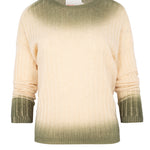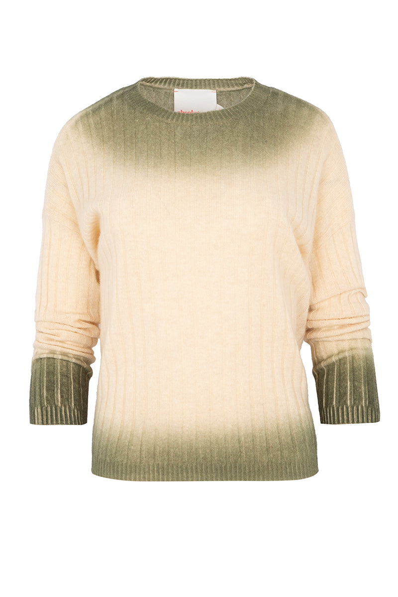 Jersey de canalé estilo oversize, de la firma francesa absolute cashmere. Cuello caja y manga larga . Color crudo en degradé a verde laurel . Composición: 100% cashmere.