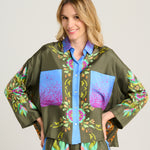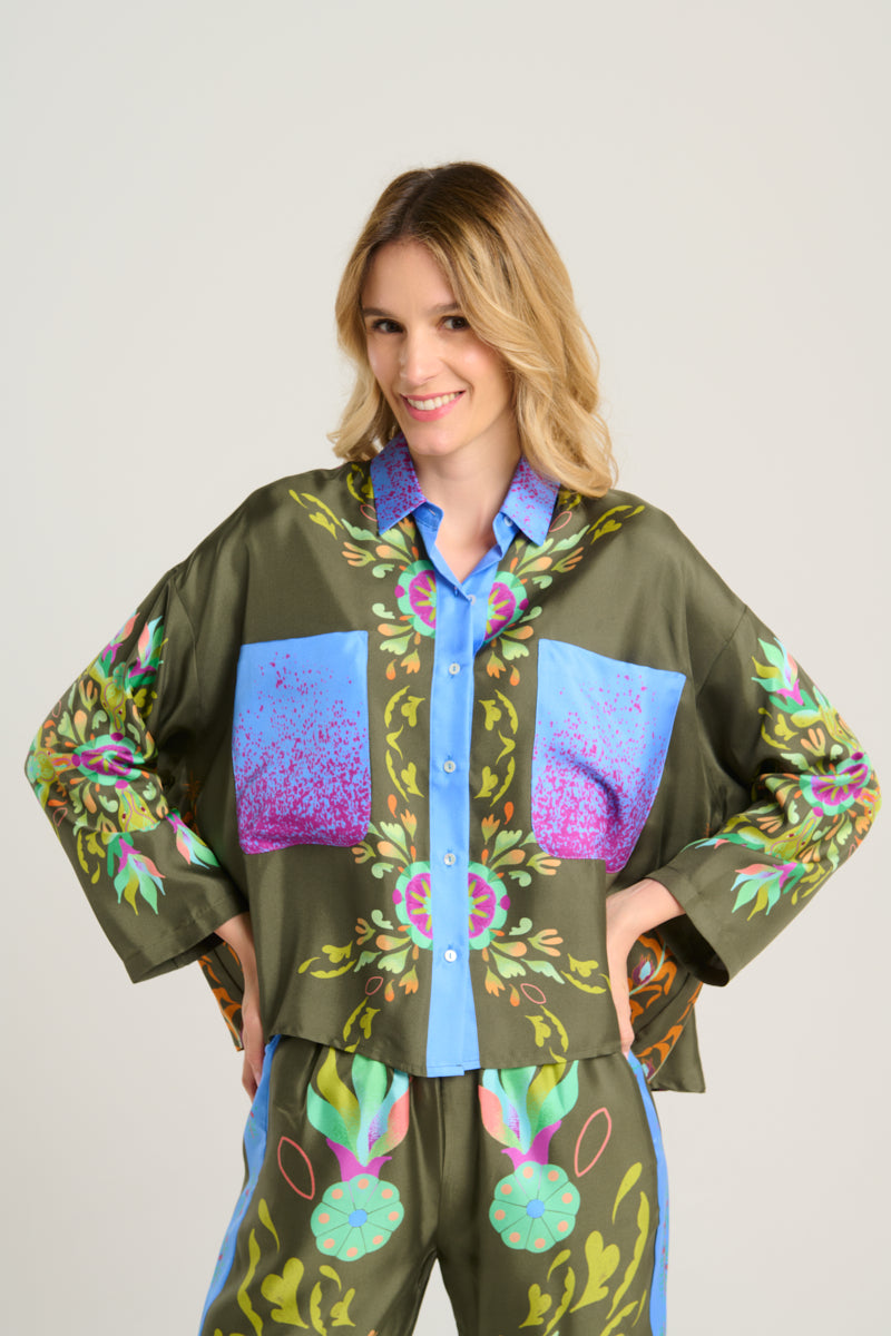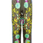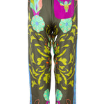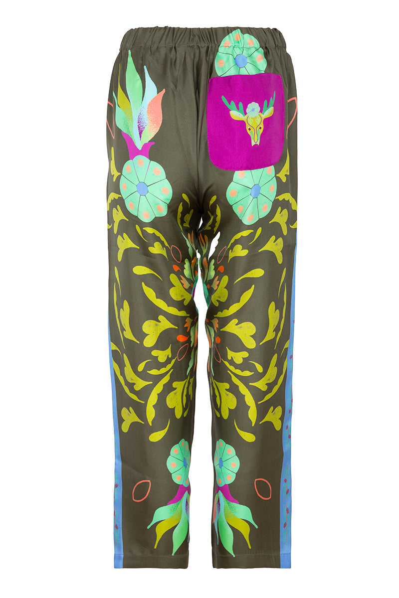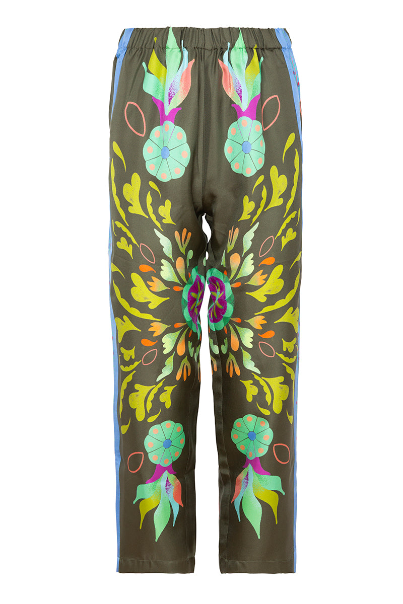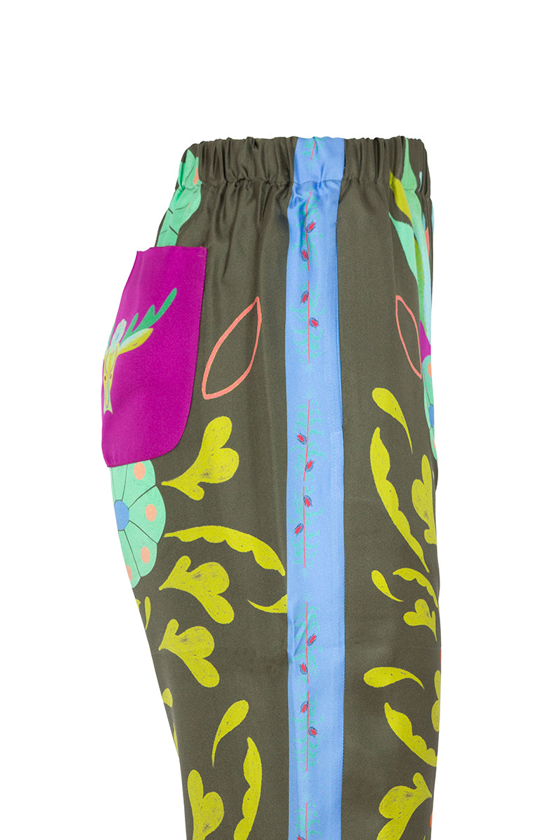 Pantalón de la firma italiana Franco Ferrari de la colección cápsula en colaboración con Naandeyé García artista ilustradora mexicana. Cintura con goma elástica. Estampado floral en tonos lima, azul, menta y fucsia sobre fondo verde oliva. Banda lateral estampada en contraste. Bolsillo plastron en parte trasera. Composición 100% seda.