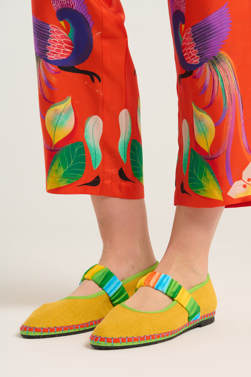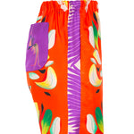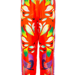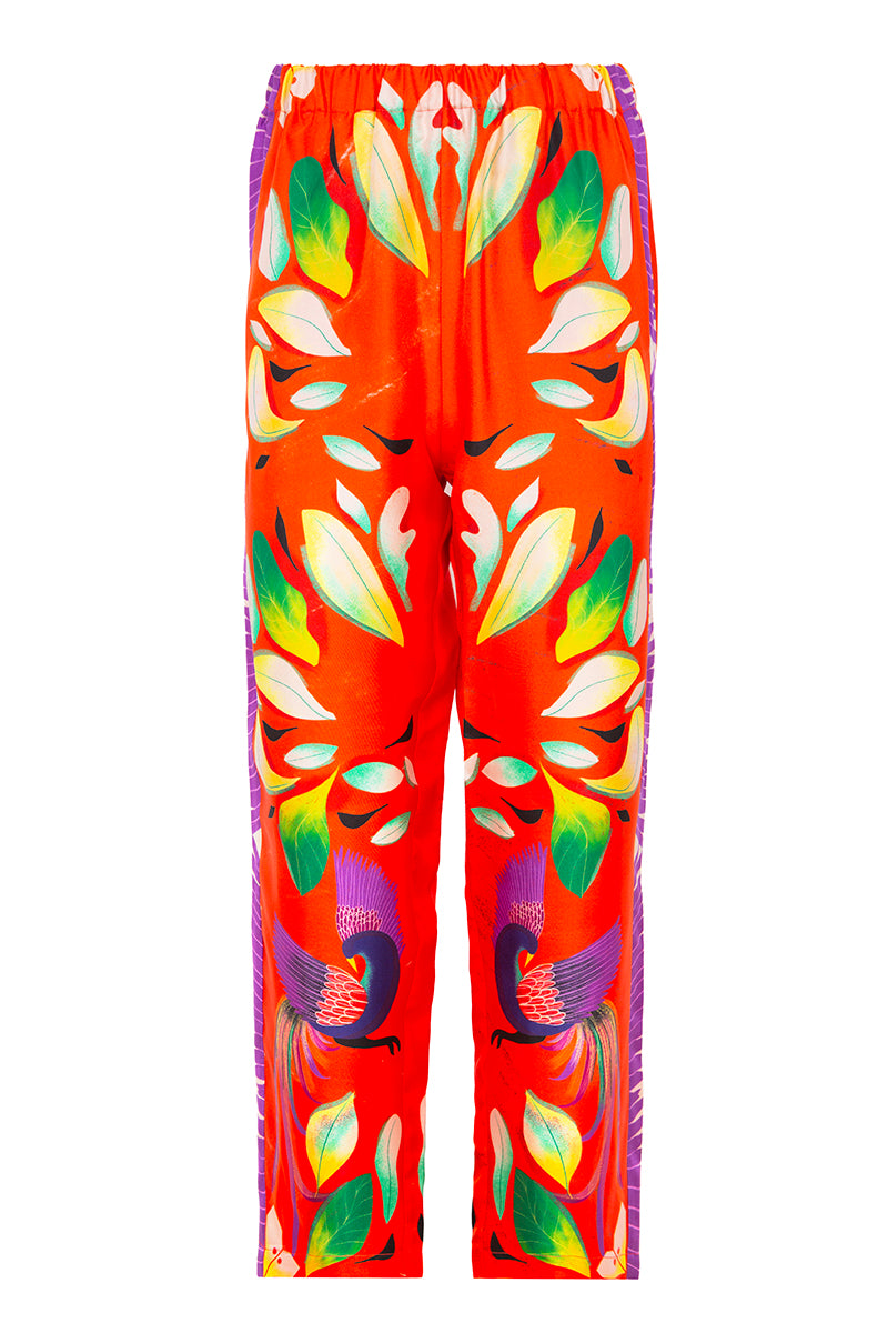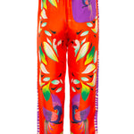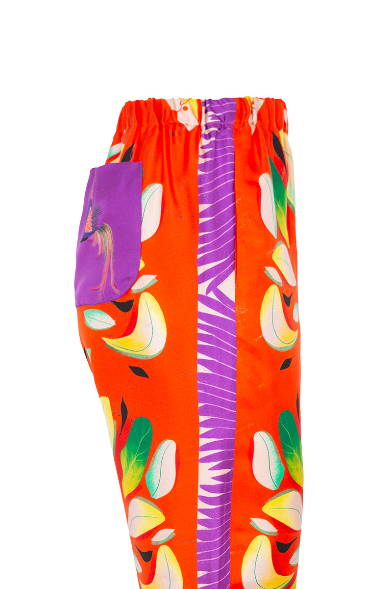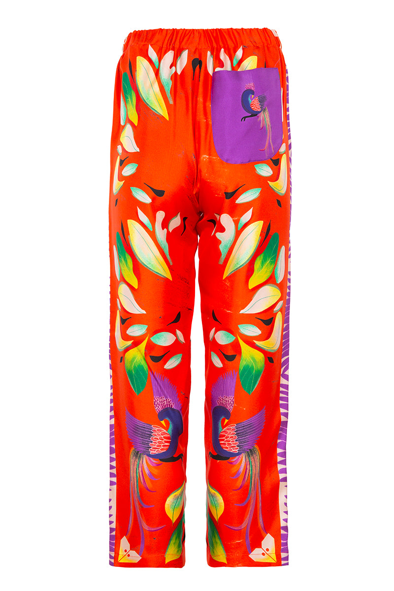 Pantalón de la firma italiana Franco Ferrari de la colección cápsula en colaboración con Naandeyé García artista ilustradora mexicana. Estampado floral en tonos verdes, amarillos y morados sobre fondo rojo anaranjado .Banda lateral estampada en contraste. Bolsillos laterales. Bolsillo plastron en parte trasera. Posibilidad de combinar con la camisa a juego Composición 100% seda.