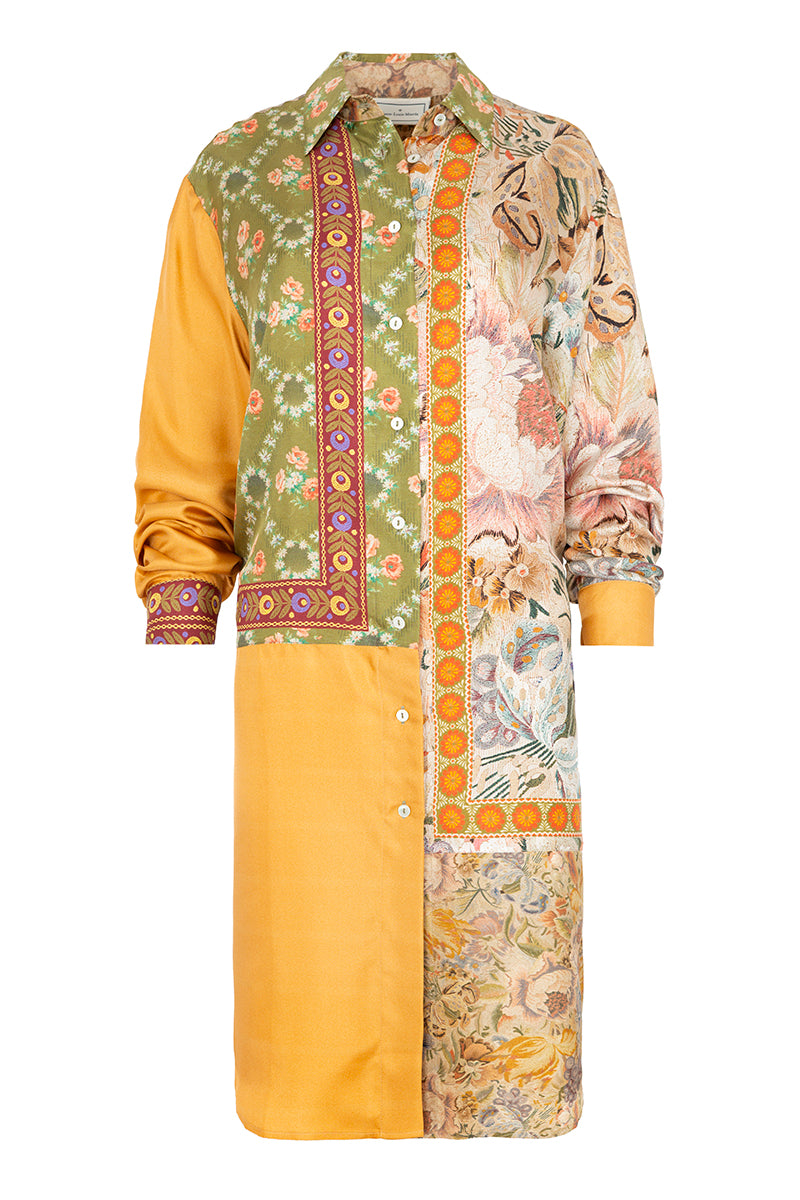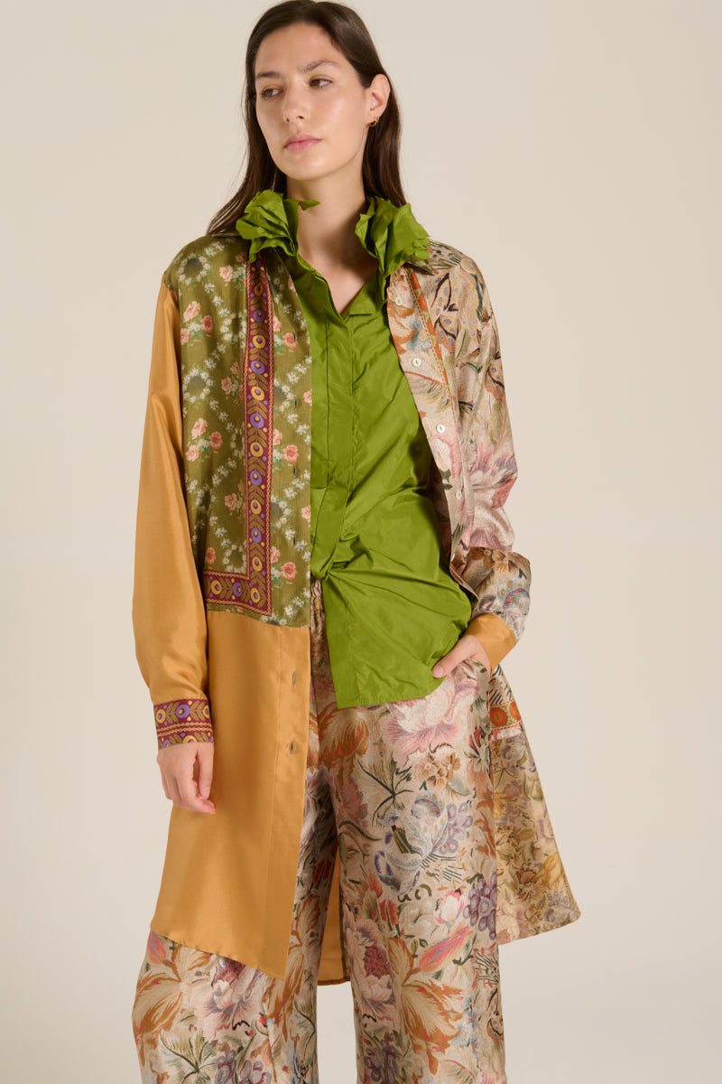 Camisa túnica de manga larga en seda de la firma italiana Pierre-Louis Mascia. Camisa de patrón fluido, con estampado botánico simétrico en tonos vivos. Presenta flores, hojas y frutos estilizados en colores naranjas, verde, rosáceo y crudos, creando un diseño vibrante y elegante. Composición: 100% seda. Hecho en Italia. Tallaje italiano.