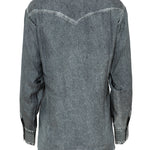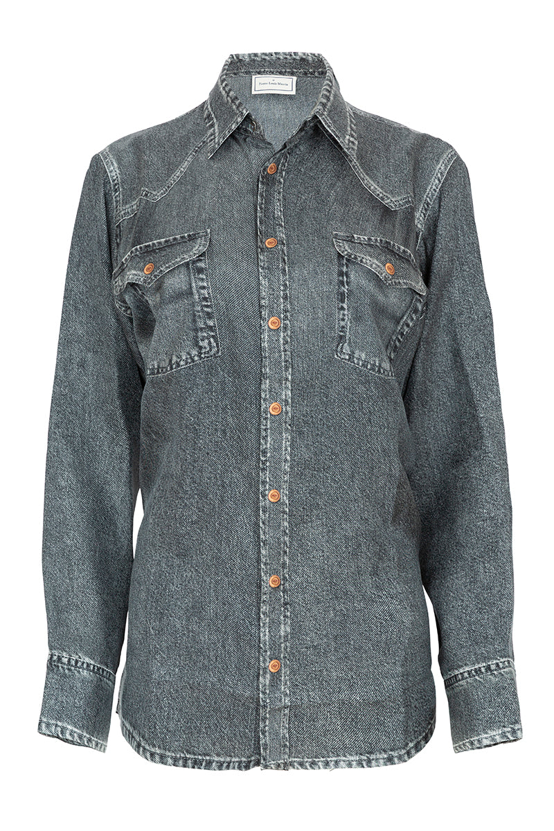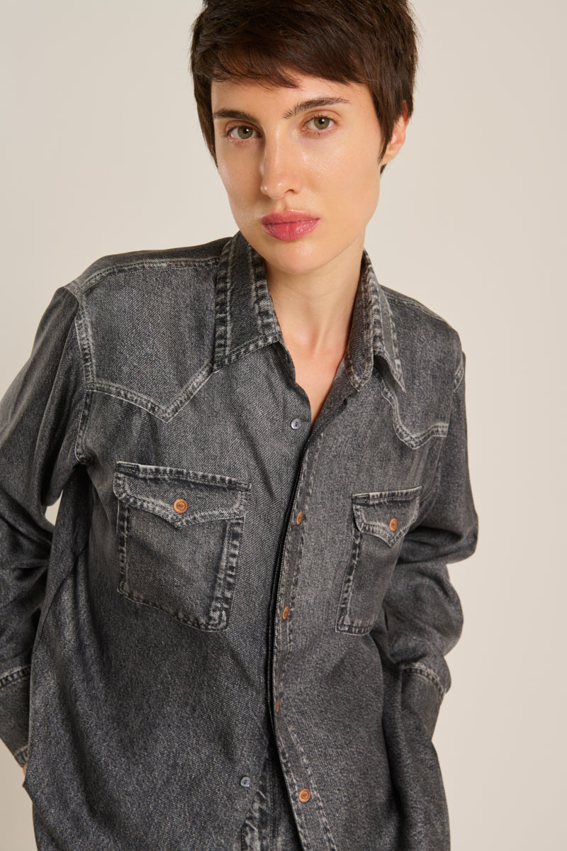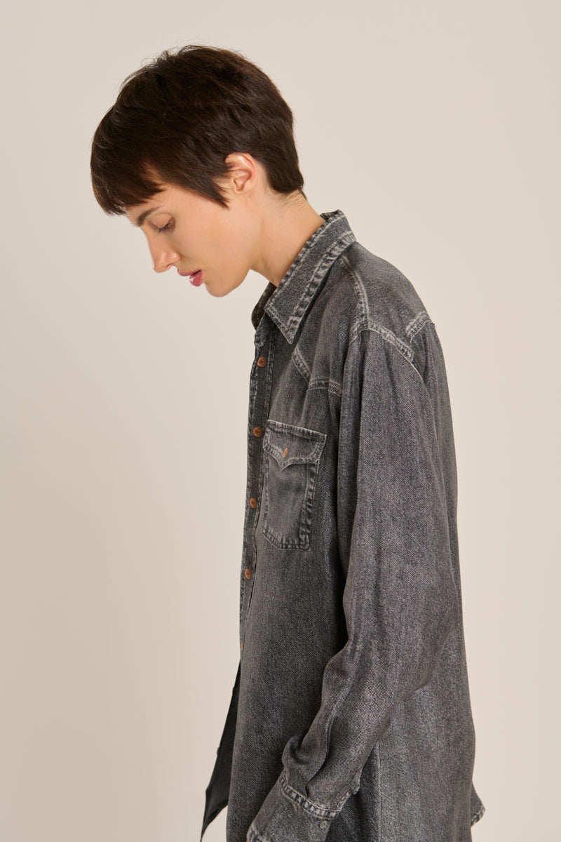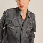 Original camisa de seda, de la firma italiana Pierre Luis Mascia, con efecto trampantojo, simulando corte , costuras , botones y tejido vaquero . Bolsillos delanteros con tapilla y cierre con botones ocultos al tono. Color gris efecto lavado. . Composición: 100% seda. hecho en Italia , tallaje italiano.