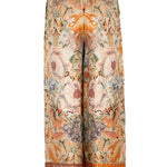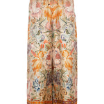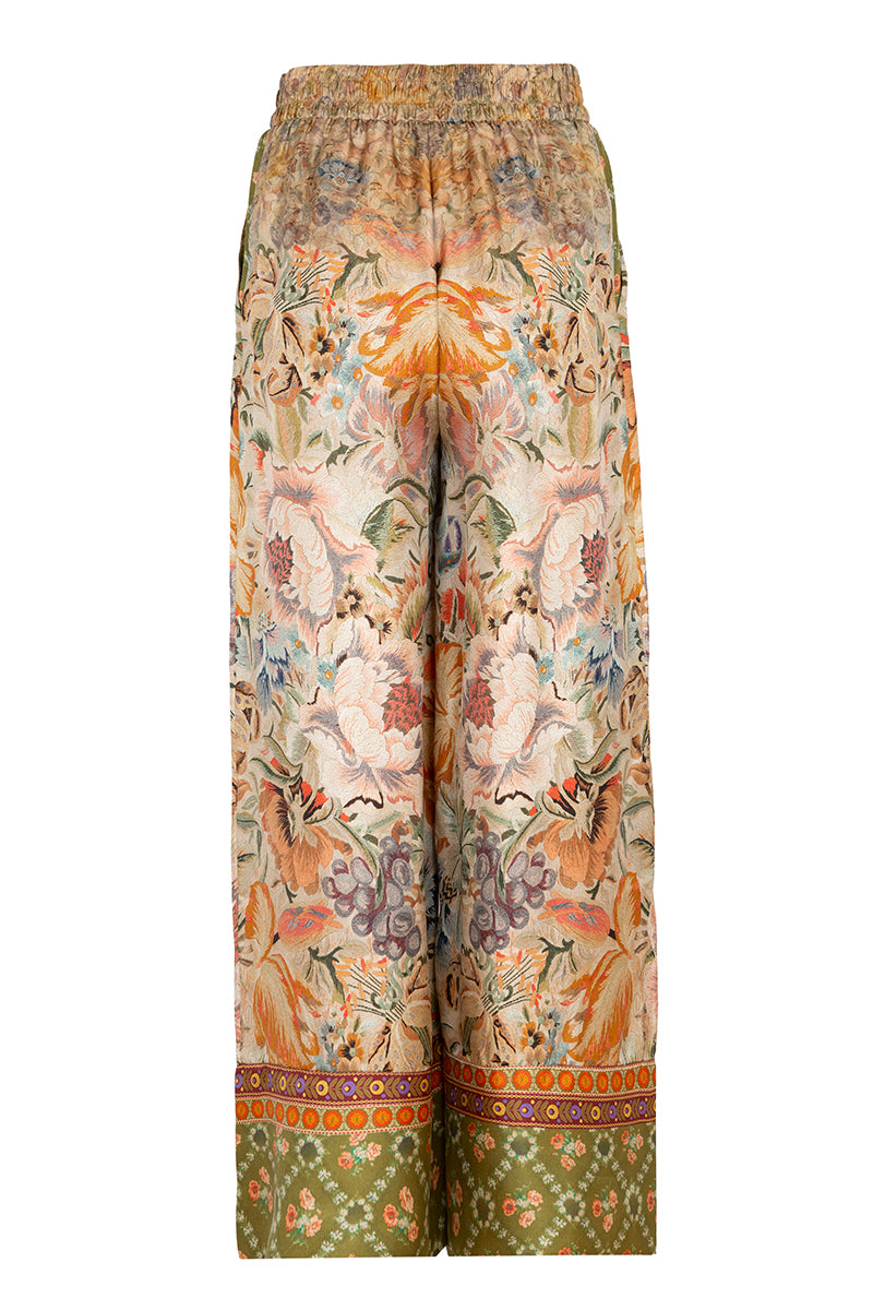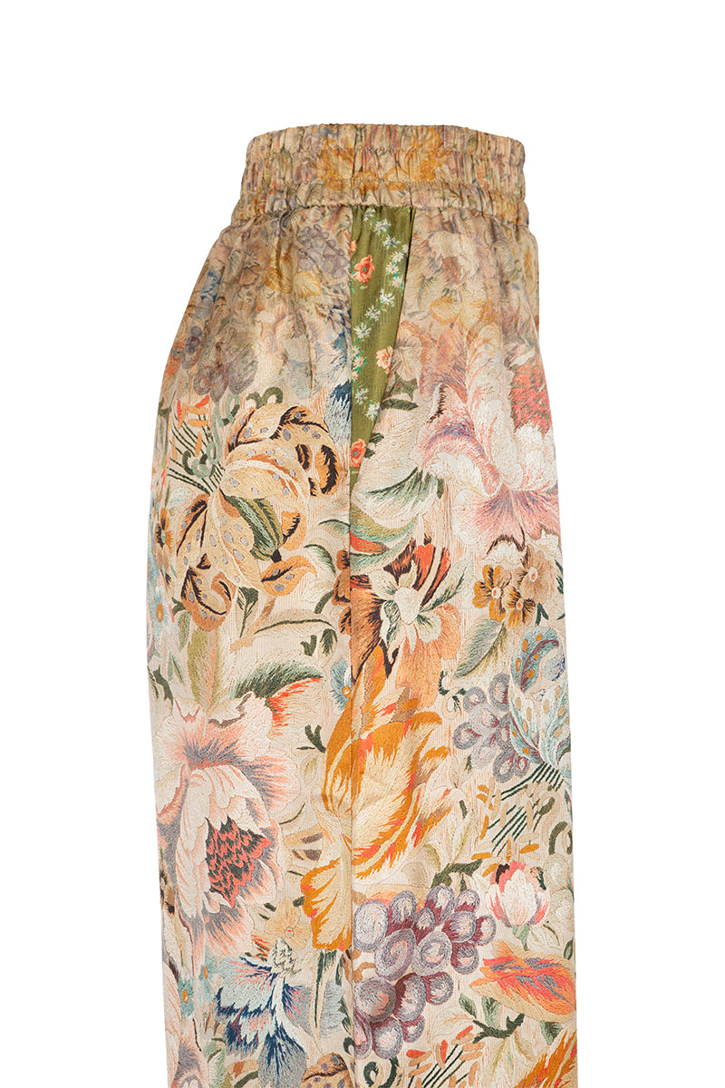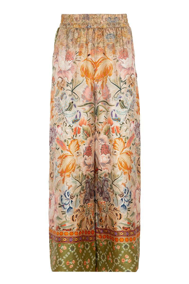 Pantalon aplazó en seda de la firma italiana Pierre-Louis Mascia de patrón fluido, con estampado botánico simétrico en tonos vivos. Presenta flores, hojas y frutos estilizados en colores naranjas, verde, rosáceo y crudos, creando un diseño vibrante y elegante. Cinturilla elástica y bolsillos laterales. Composición: 100% seda. Hecho en Italia. Tallaje italiano. Tiene la posibilidad de combinarlo con su camisa túnica a juego.