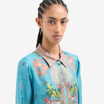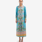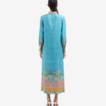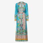 Vestido largo fluido en seda. Color turquesa con combinación de estampados paisley, geométrico y liberty multicolor ribeteado en color ambar. Cinturón a juego. Composición: 100% seda . Tallaje italiano, hecho en Italia .