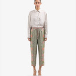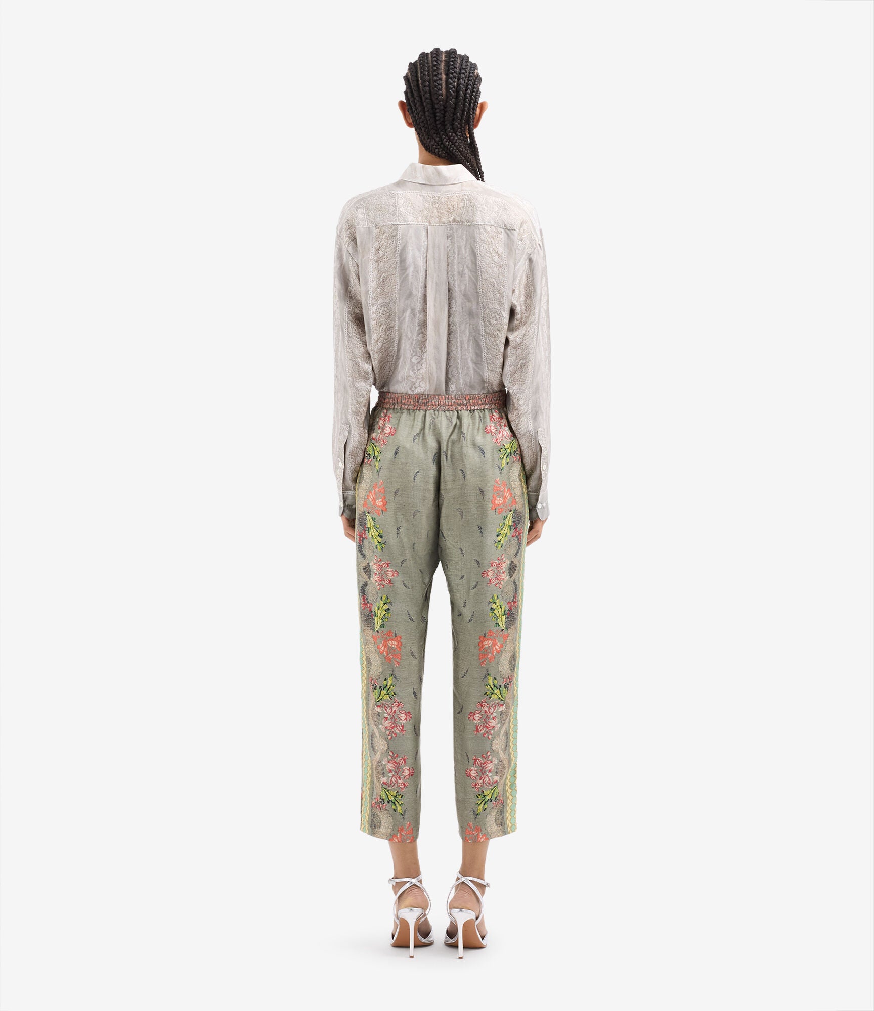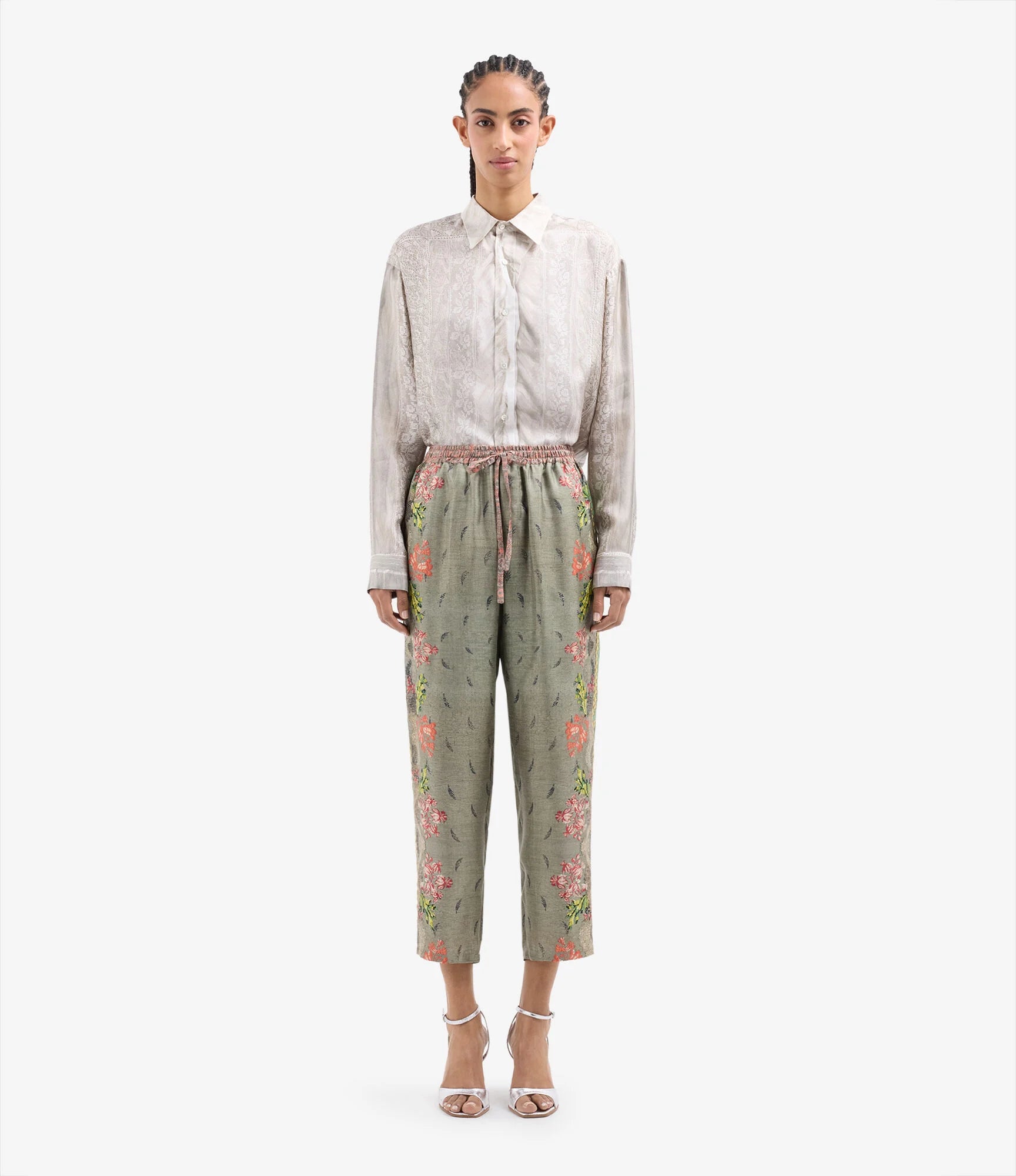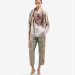 Pantalón fluido con cinturilla elástica , bolsillos laterales y cinta para ajustar. Color verde, combinación de estampados paisley, geométrico y liberty multicolor. Cenefa geométrica en tonos mostaza en los costados. Composición :100% Seda. Hecho en Italia. Tallaje italiano.