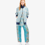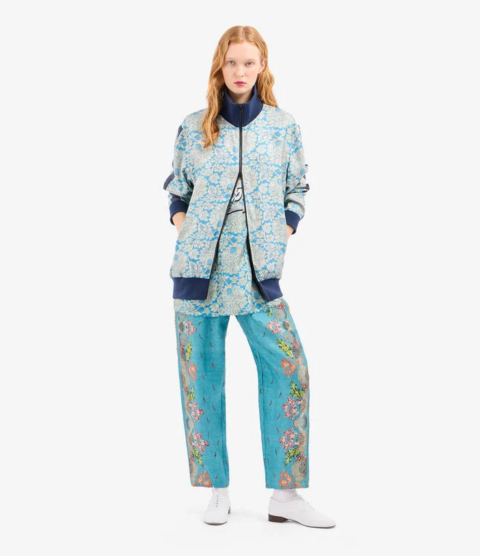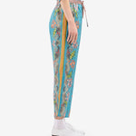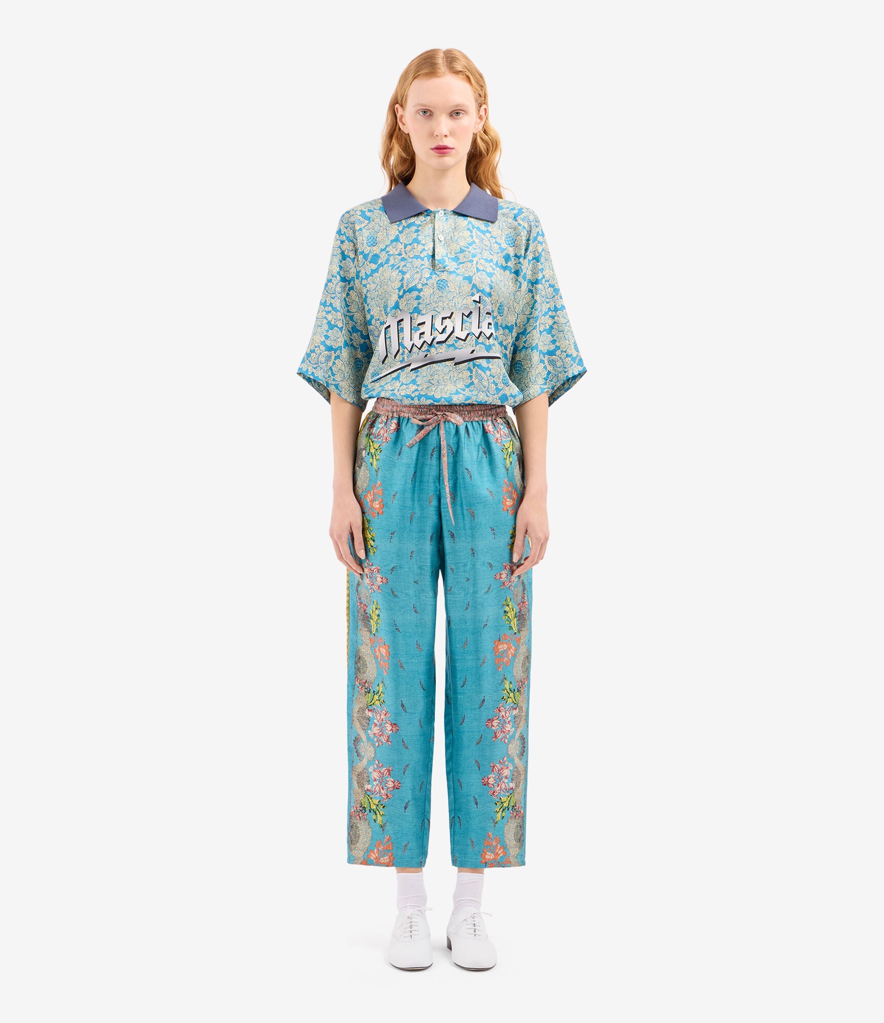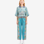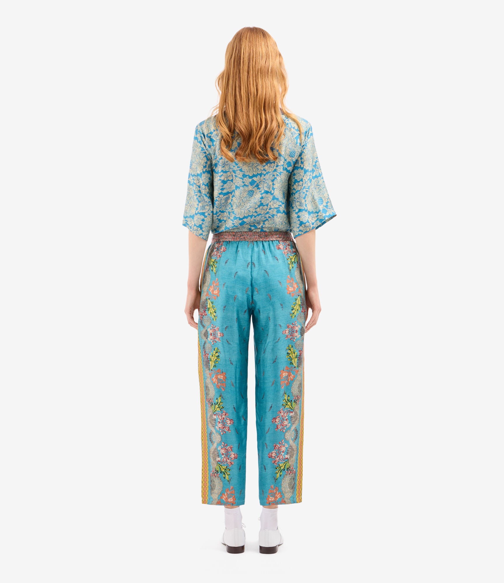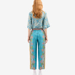 Pantalón fluido con cinturilla elástica , bolsillos laterales y cinta para ajustar. Color turquesa, combinación de estampados paisley, geométrico y liberty multicolor. Cenefa geométrica en tonos mostaza en los costados . Composición :100% Seda. Hecho en Italia. Tallaje italiano.