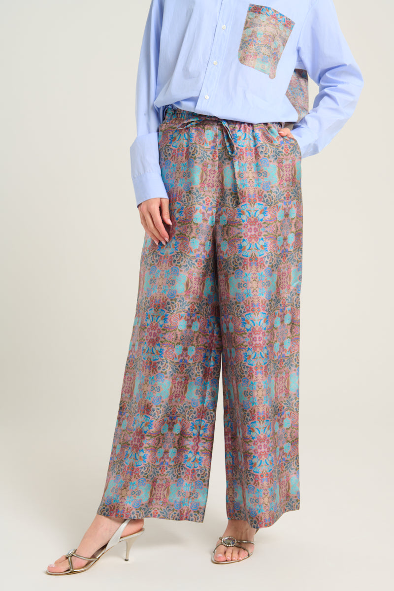 Pantalón fluido con cinturilla elástica , pernera ancha y bolsillos laterales . Cierre con botón y cinta para ajustar. Estampado floral inspiración vintage en tonos enpolvados y deslavados con matices de azul cielo, verde agua, rosa antiguo y toques tierra. Dibujo ligeramente difuminado como si estuviera envejecido por el tiempo. Composición:100% Seda. Hecho en Italia. Tallaje italiano.