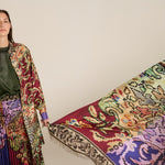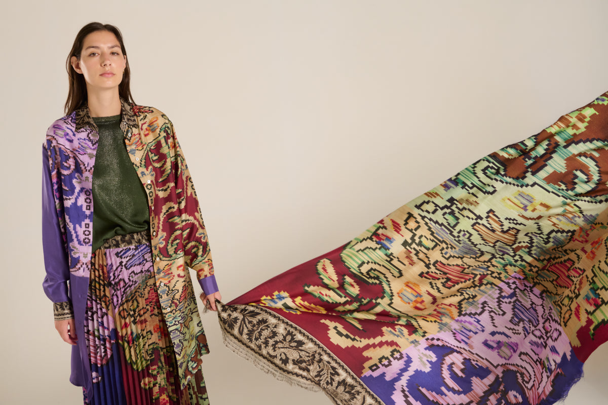 Pañuelo Pierre-Louis Mascia en seda natural. Estampado geométrico floral de estilo persa, en tonos grana, malva y verde. Composición: 100% seda. Desflecado medio. Tamaño: 135 x 195 cm. Hecho en Italia.