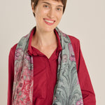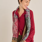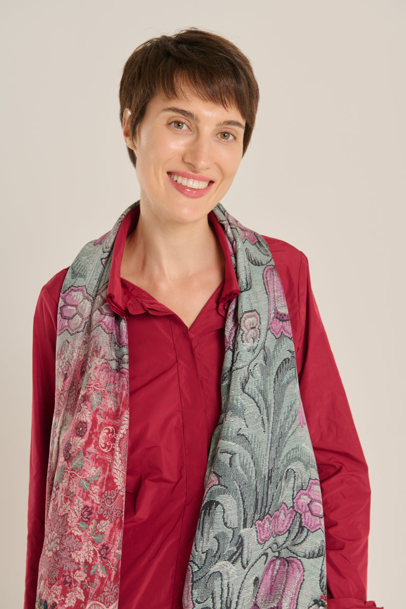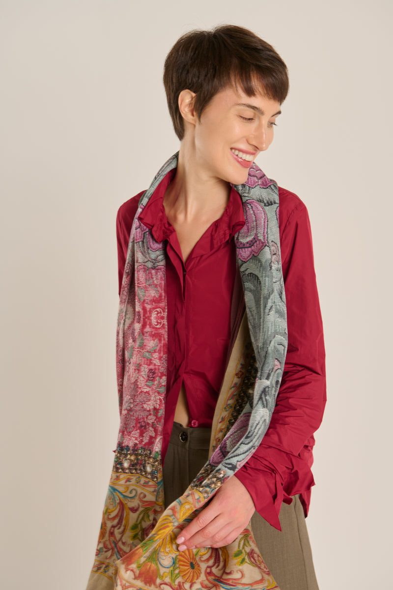 Pañuelo doble de la firma italiana Pierre-Louis Mascia. Por un lado seda con estampado geométrico floral de estilo persa, en tonos grana,malva y verde, reverso en modal en color granate oscuro.Composición: 100% seda, 90% modal, 10% cashmere.. Hecho en Italia.