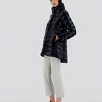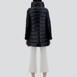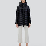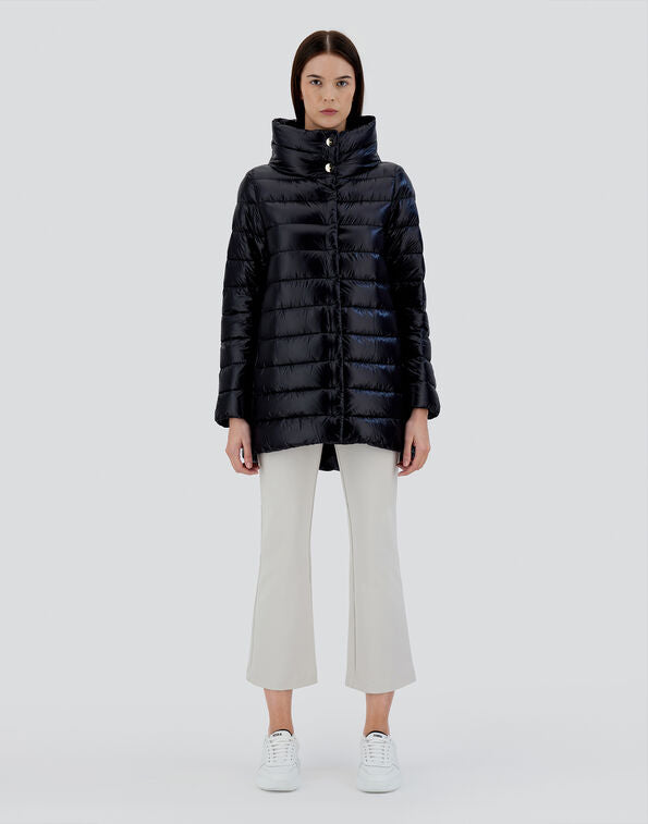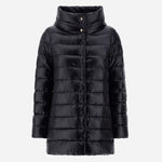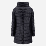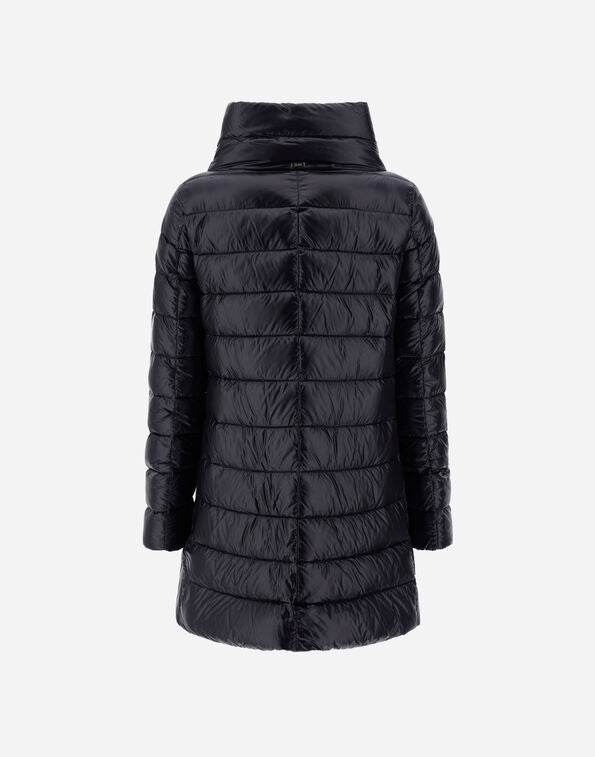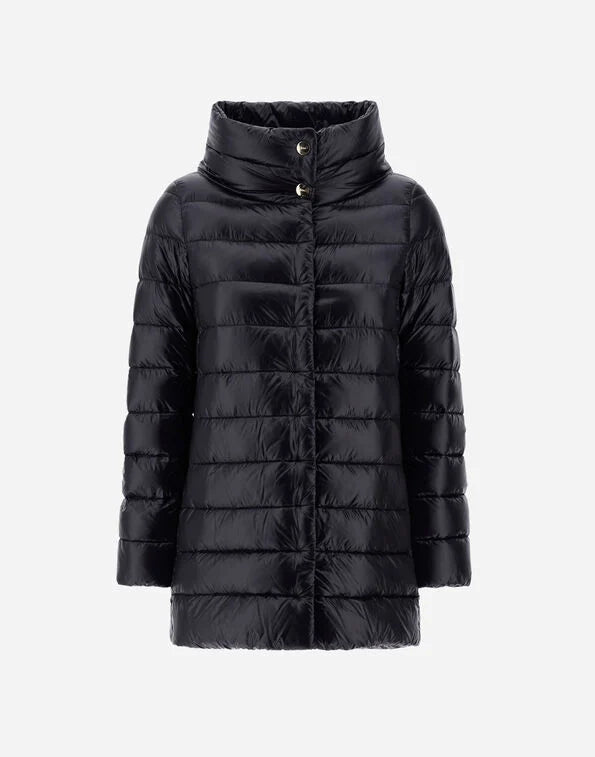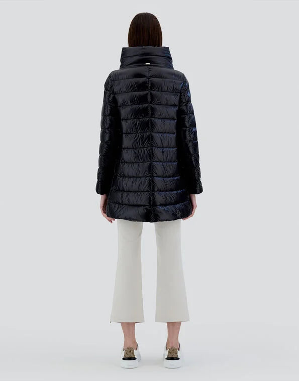 Plumino de oca de la marca Herno color negro. Modelo AMELIA. Patrón evasé con acabado brillo, manga larga, bolsillos laterales, cierre con botones ocultos. Composición: 100% Polyamide, 90% plumino, 10% pluma. Ultralight.Gramaje 2 plumas. Tallaje italiano. Ref: PI505DIC-12017-9300