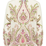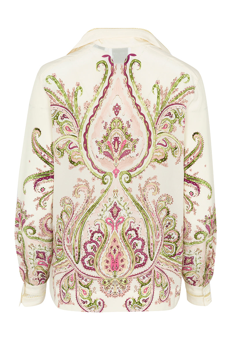 Camisa de manga larga con cuello solapa y detalle de entredós en cuello y puños, cierre con botones y pequeñas aberturas en los laterales.Estampado pasley en tonos verde, rosa y berenjena sobre fondo blanco roto. Composición 100% seda.