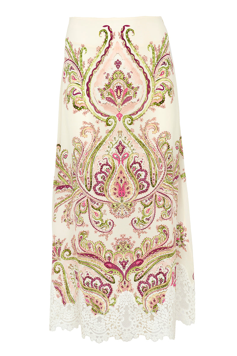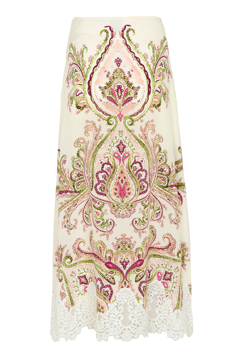 Falda midi con cremallera invisible lateral y cintura rematada con vista, detalle de encaje rebrodé en todo el bajo.Estampado pasley en tonos verdes, rosa y berenjena sobre fondo blanco roto. Composición 100% seda.