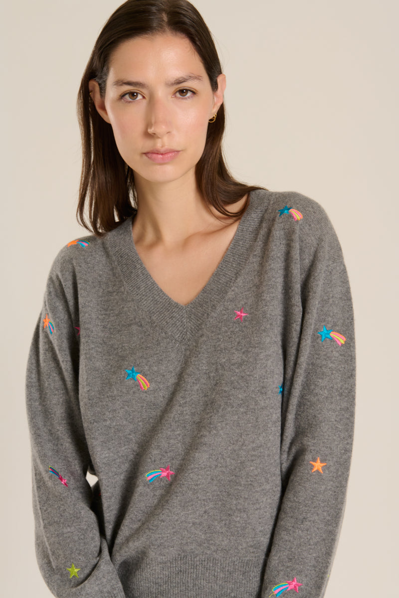 Jersey de la firma Brodie Cashmere de cuello pico en color gris marengo. Bordado de estrellas multicolor. Raya de color amarillo flúor en puños. Composición: 100% Cachemire.