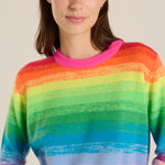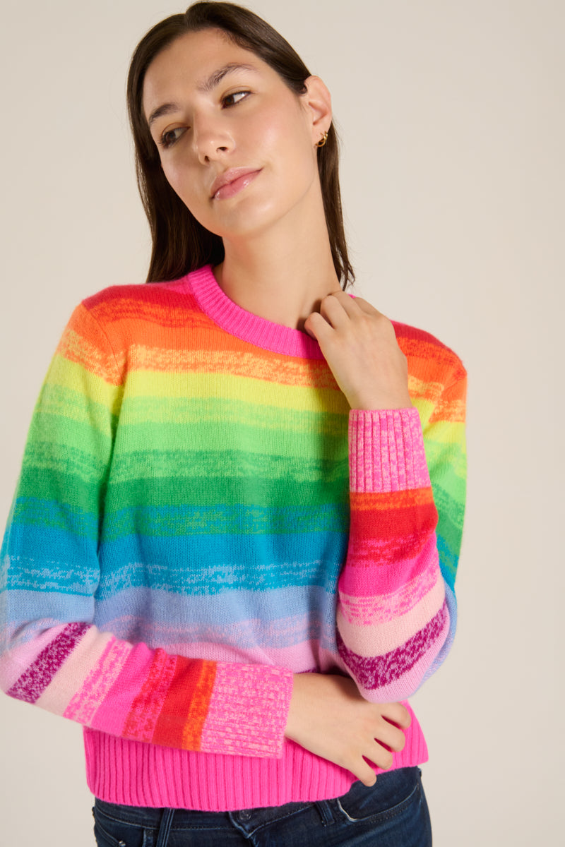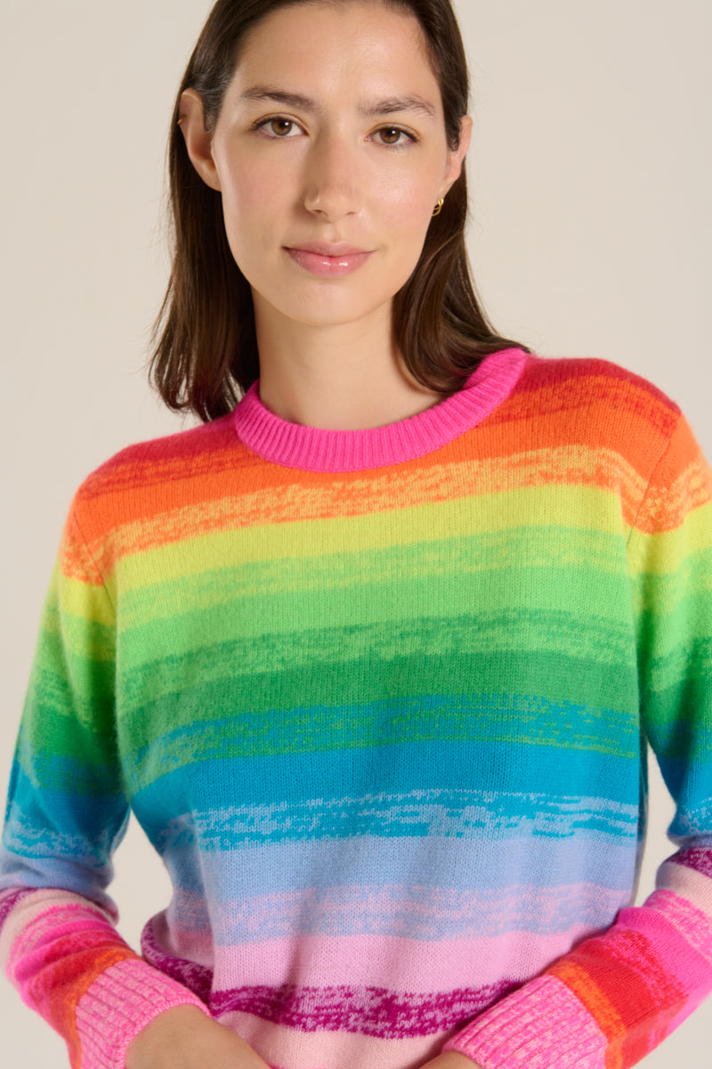 Jersey de rayas multicolor de la firma Brodie Cashmere. Cuello a la caja y rayas en tonos flúor. Composición: 100% Cashmere.