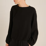 Top crop de la firma italiana Herno, ligeramente oversize . Cuello caja y manga larga con elástico en el puño. Cintas de gross grain a los lados para recoger y fruncir el bajo. Tejido fluido estilo neopreno. Composición: 100% poliéster. Hecho en Italia. Tallaje italiano.
