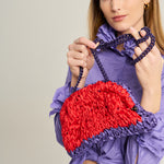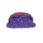 Bolso tricot de cinta de grosgrain tipo clutch bicolor. Color rojo y morado. Cierre con boquilla y cadena en color morado. Bolsillo interior. Composición: 100% Poli. Hecho a mano en Italia.