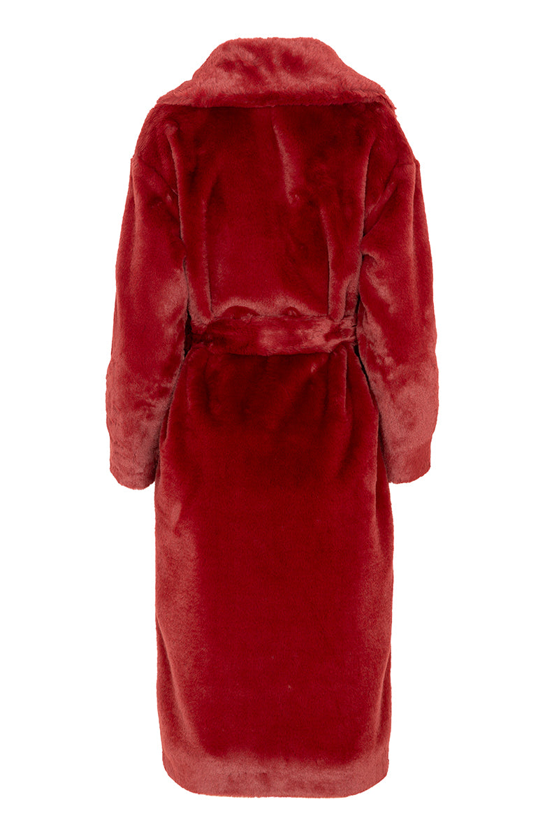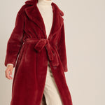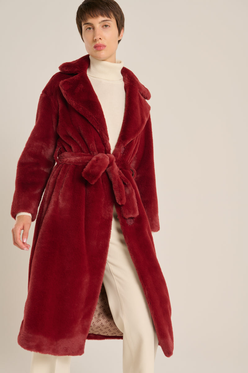 Abrigo eco fur, de la marca Herno. Cierre con cinturón y automáticos, forrados al tono. Largo midi y bolsillos invisibles. Color burdeos. Composición: 100% poliéster. Tallaje italiano. Ref: CA000586D 12422-6705.