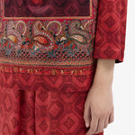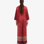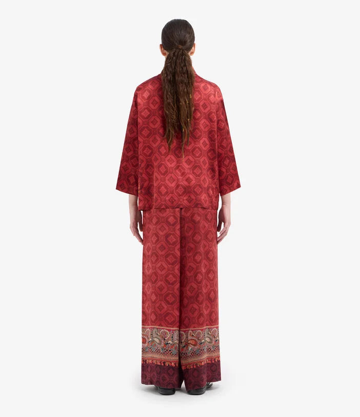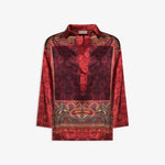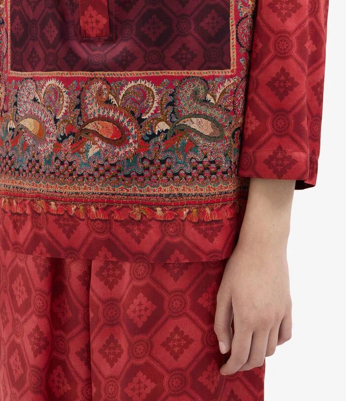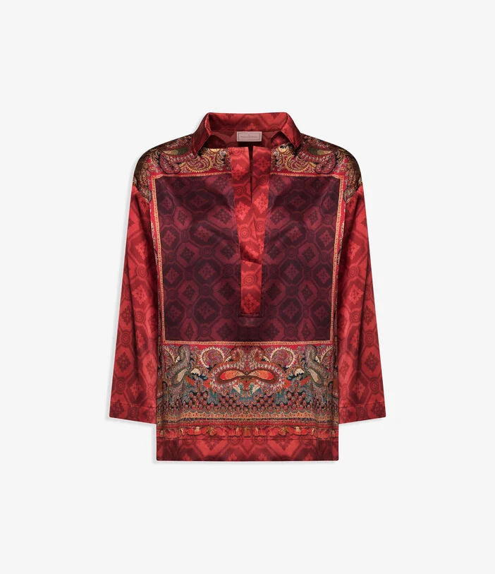 ADASTRGUM es una camisa de seda de manga larga que combina la elegancia bohemia con una riqueza ornamental de la firma italiana Pierre-Louis Mascia. Su corte relajado tipo túnica, con un escote en V abierto, fluye con naturalidad, mientras que el intrincado estampado tipo pañuelo—con bordes de paisley, motivos geométricos y ricos tonos burdeos—aporta una profundidad exótica y majestuosa. Ideal tanto para el día como para la noche, combínala con pantalones palazzo blancos o con una falda lápiz para un contraste refinado. Composición: 93% seda, 7% elastán.