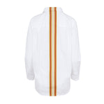 Camisa blanca de algodón, ligeramente oversize , con bolsillo en delantero. Detalle de cinta de tapiceria color crudo con rayas en rosa,mostaza y grana en la espalda. Composición: 100% Algodón. Hecha en España