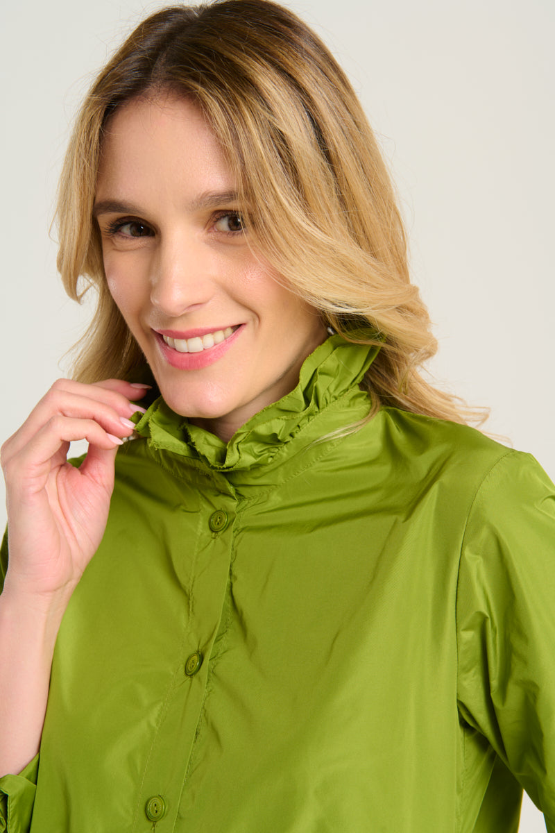Camisa de tejido tecnológico con cuello de doble volante, botones al tono y puño doble redodeado. Color pitacho . Composición: 100% Poliéster. Este tejido no se puede planchar. Tallaje alemán.