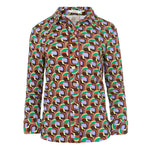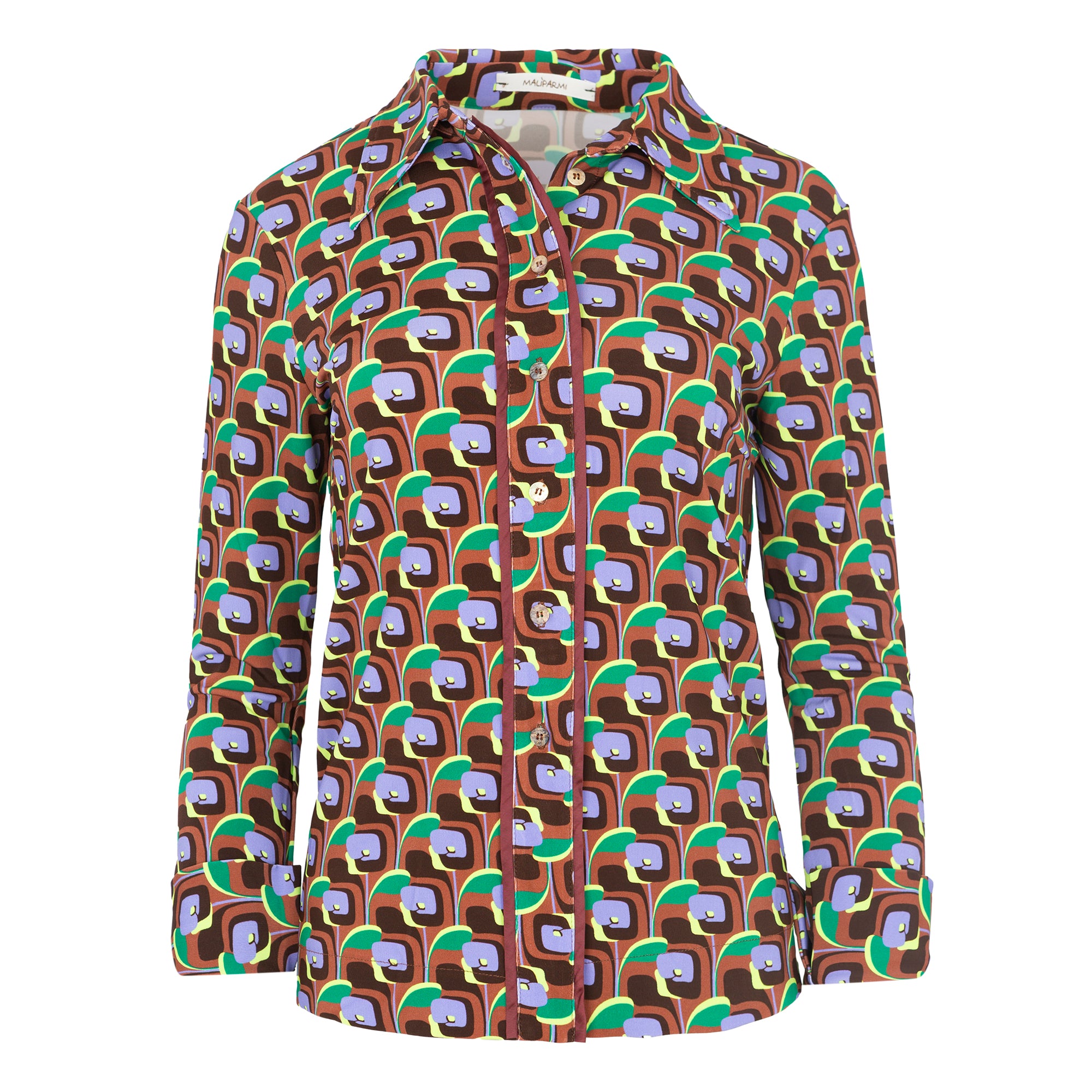 Camisa de punto jersey de la firma Maliparmi ,con dibujo geométrico en verde, amarillo chocolate y lila sobre fondo marrón. Cuello camisero, manga larga con doble puño y cierre con botones al tono. Composición: 92% Viscosa, 8% elastán. Tallaje italiano.