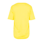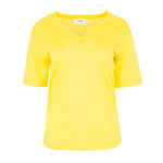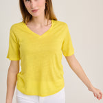 Camiseta básica con cuello pico, manga corta y ligeramente asimétrica. Bajo redondeado. Color amarillo. Composición: 100% Lino.