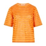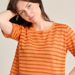 Camiseta de rayas de la marca Malíparmi con cuello redondo y manga corta. Rayas en color naranja con lurex. Composición: 33% lino, 33% poliéster, 28% viscosa, 6% lurex. Tallaje italiano. Hecho en Italia.