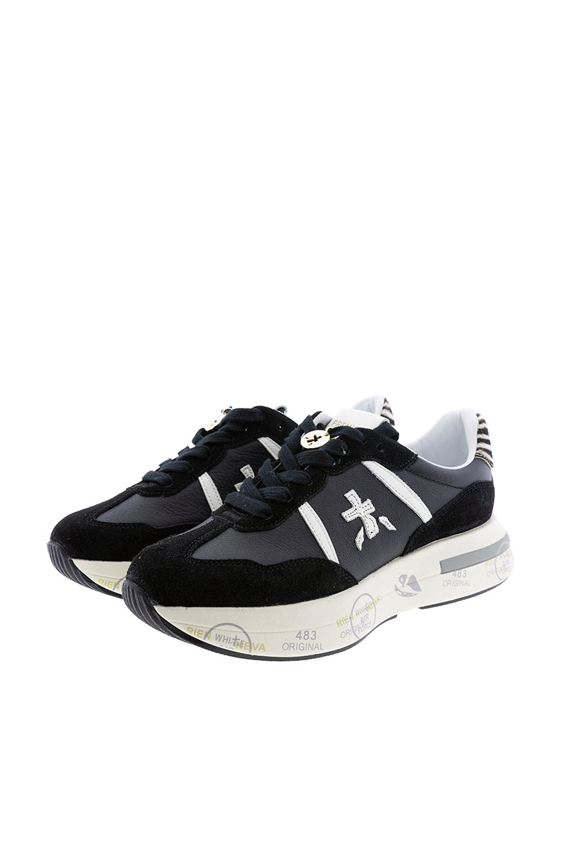Zapatilla Cassie, variante 7681. Tejido exterior en piel en color negro, con puntera y parte trasera en cuero al tono. Logo trasero en estampado animal print. Suela ancha, extra confort.