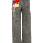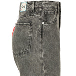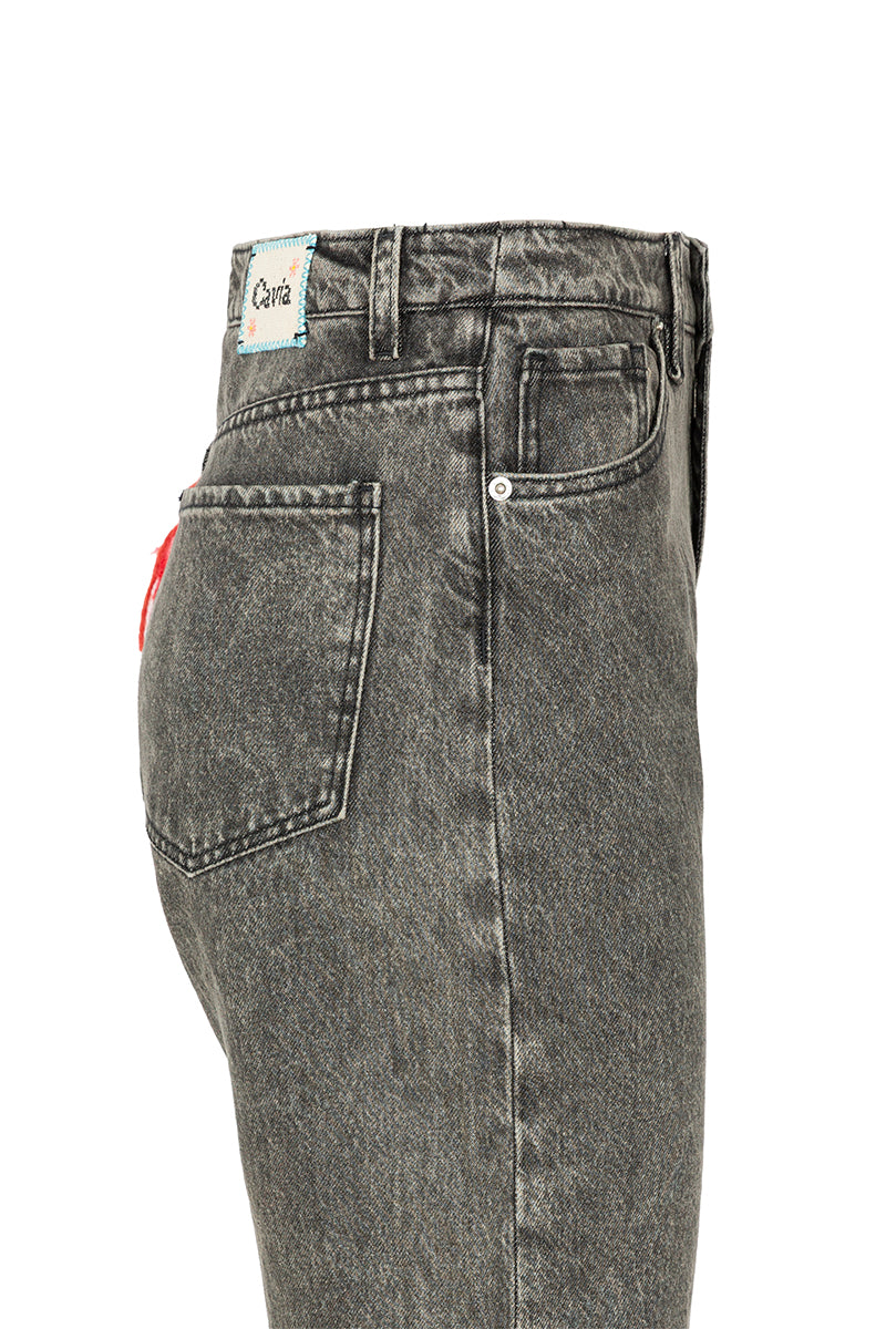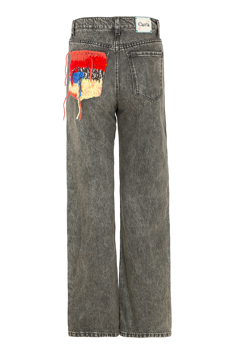 Pantalón vaquero de la firma italiana Cavia, recto, de pierna ancha y detalle de crochet multicolor en bolsillo trasero. Cierre con botón y cremallera. Color gris medio efecto desgastado .Composición: 100% algodon reciclado. Hecho 100% en Italia.