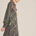 Vestido midi de la firma italiana Cavia. Con cuello polo, base en tonos grises y detalle de hilos multicolor cruzándose en forma de rombo. Composición mixta (upcicling) mayormente lana. Tallaje italiano. Hecho en Italia. Tallaje Italiano.