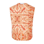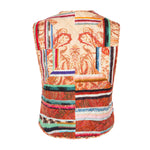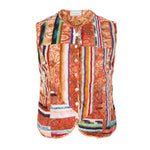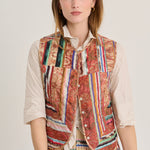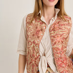 Chaleco acolchado con estampado efecto crochet y ribeteado con estampado paisley como su interior predominando los tonos beige y teja. Cierre con botones. Opción de usar por ambos lados. Composición: 74% seda, 26% poliester.
