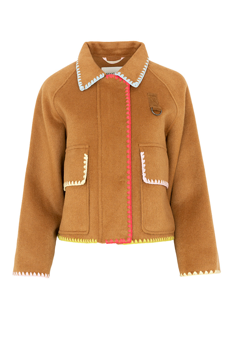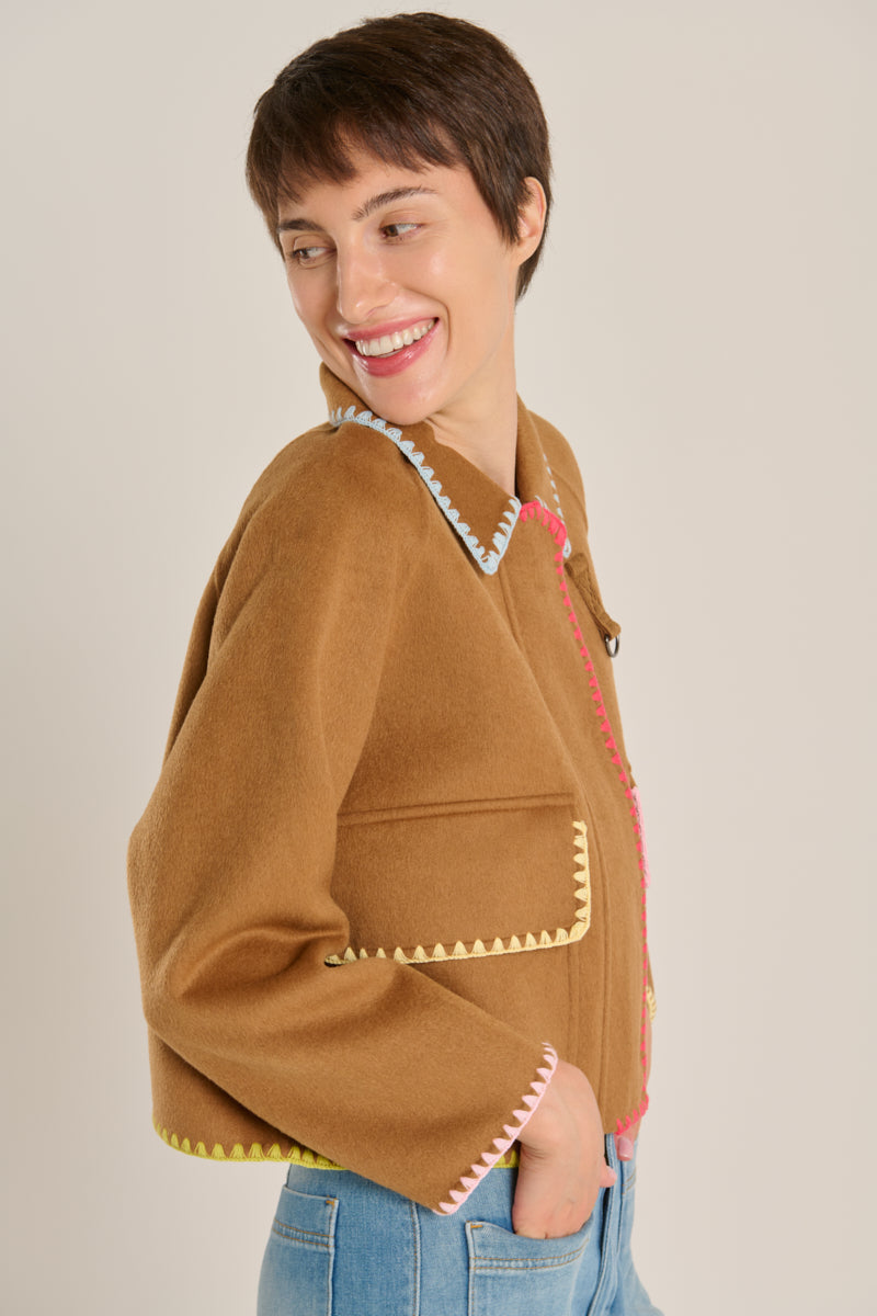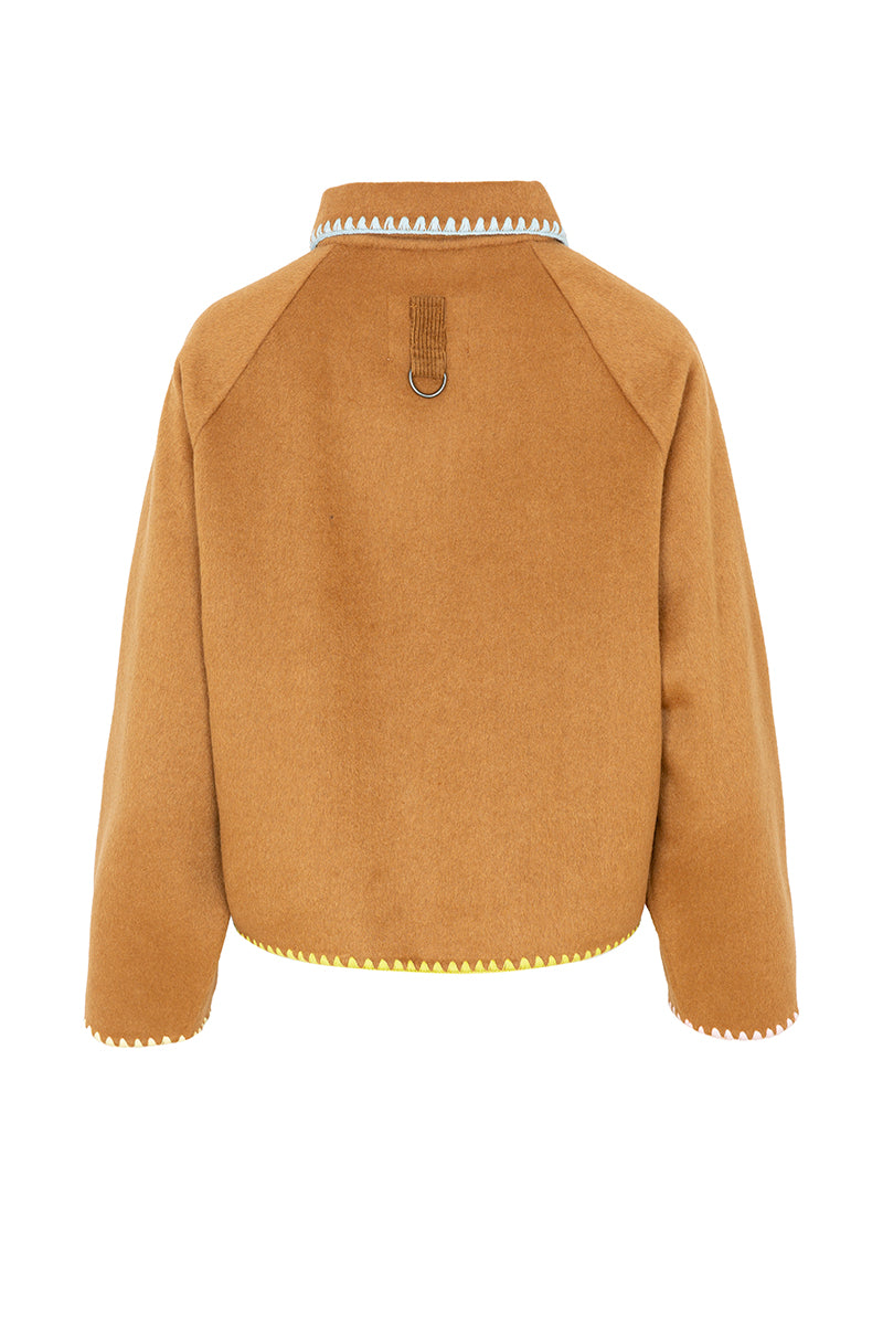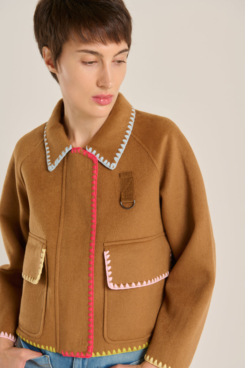 Chaqueta corta de paño bordada . Cuello camisero, manga larga raglán y cierre con cremallera y automáticos metálicos. Maxi bolsillo con tapeta . Color camel ribeteado con festón multicolor . Composición: 50% lana , 50% poliéster.