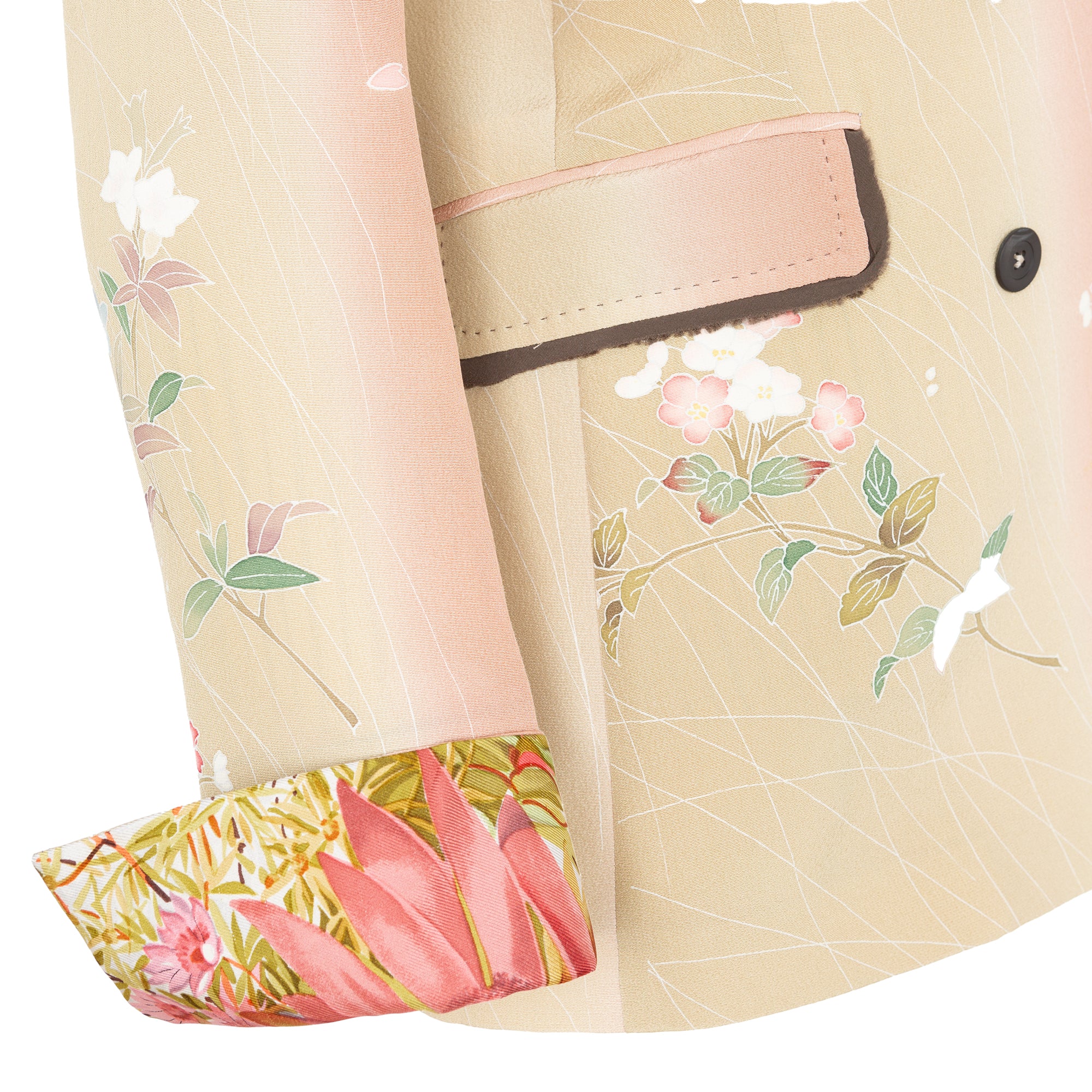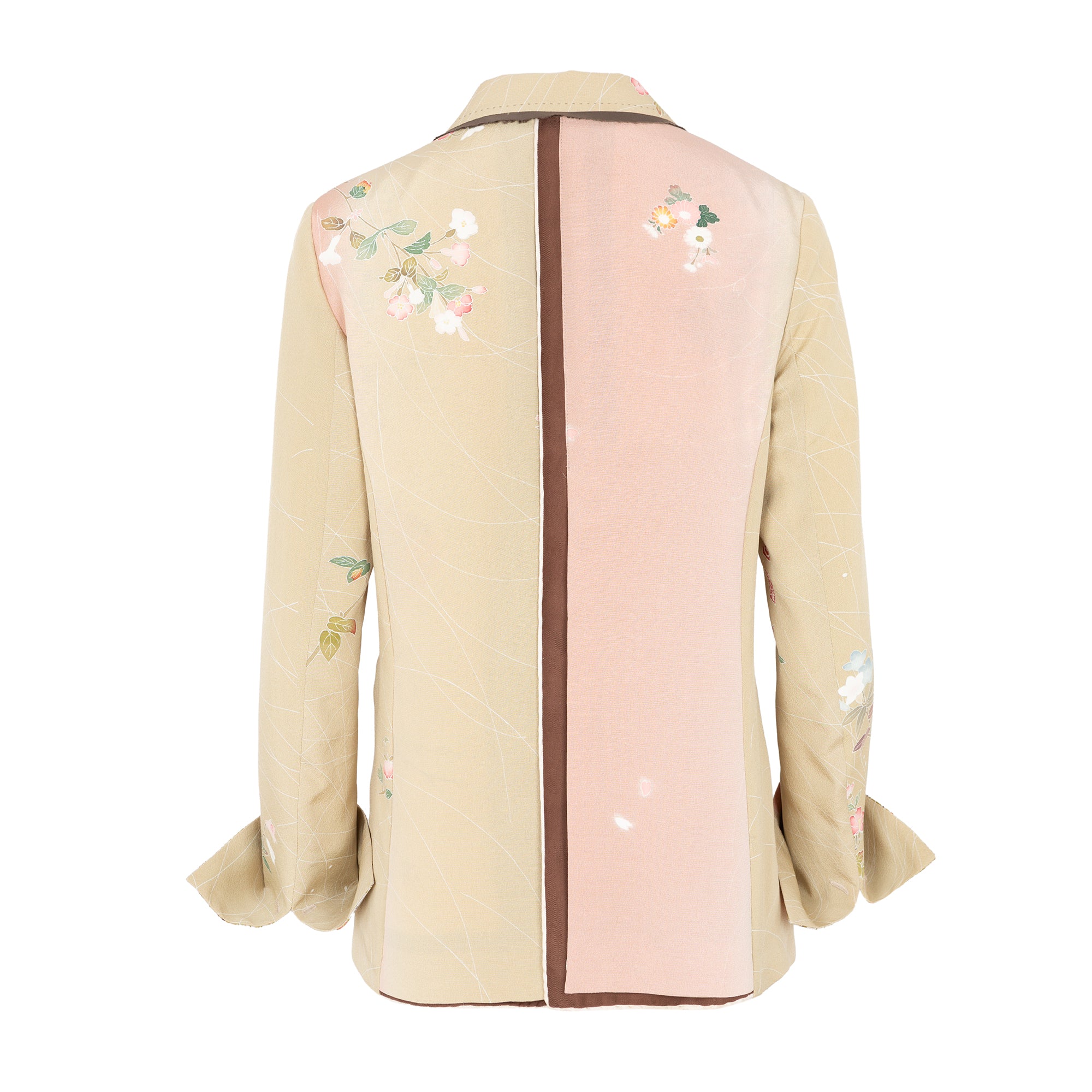 Chaqueta tipo blazer estampada con base clarita. Estampado floral. Solapa tipo smoking con ribete negro desflecado en el contorno. Cierre frontal con doble botonadura. Bolsillos delanteros con solapa. Manga larga con vuelta en seda en contraste. En la espalda lleva una ligera abertura con fondo de pañuelo de seda en contraste. Cada pieza es unica en su talla e irrepetible, ya que esta confeccionada de tejido de kimono japonés antiguo. Composición: 100% seda. Tallaje italiano. Hecho Italia.