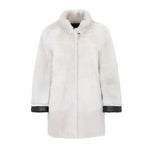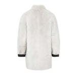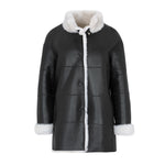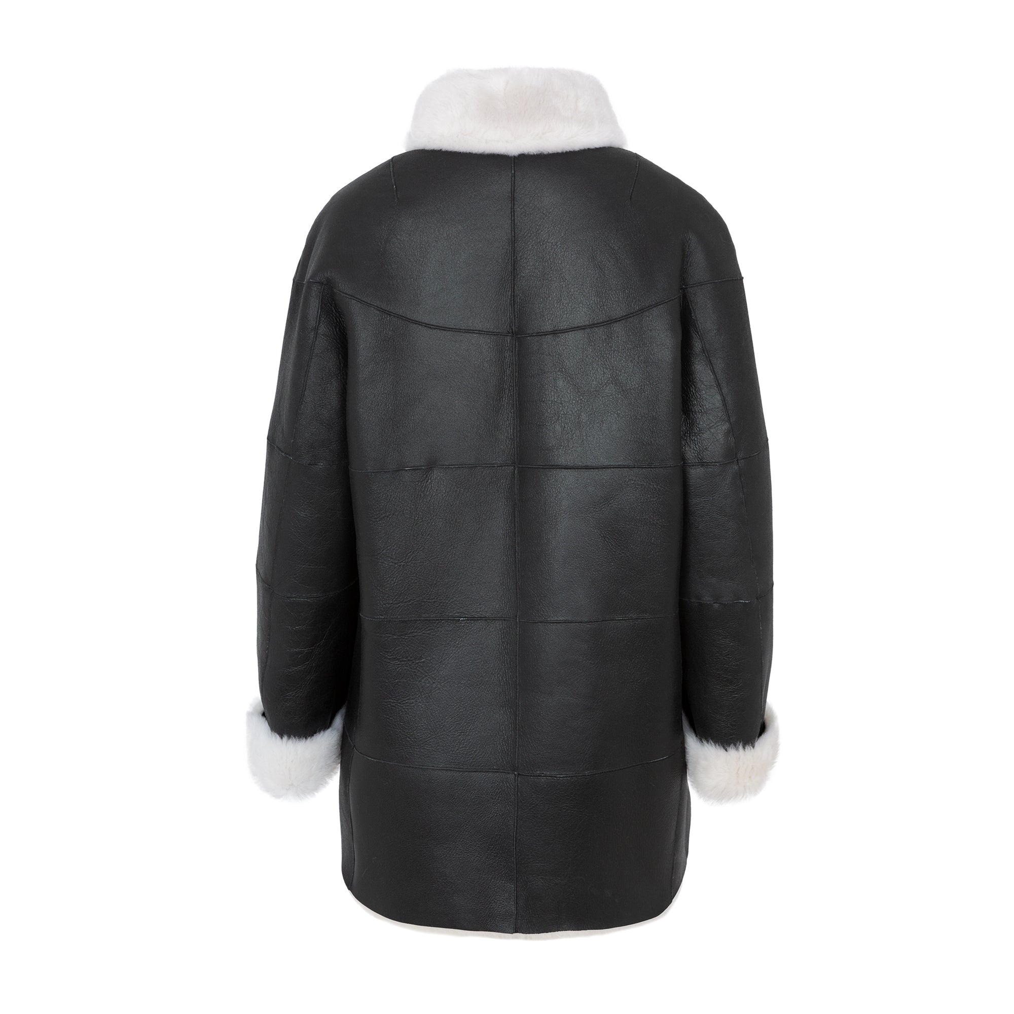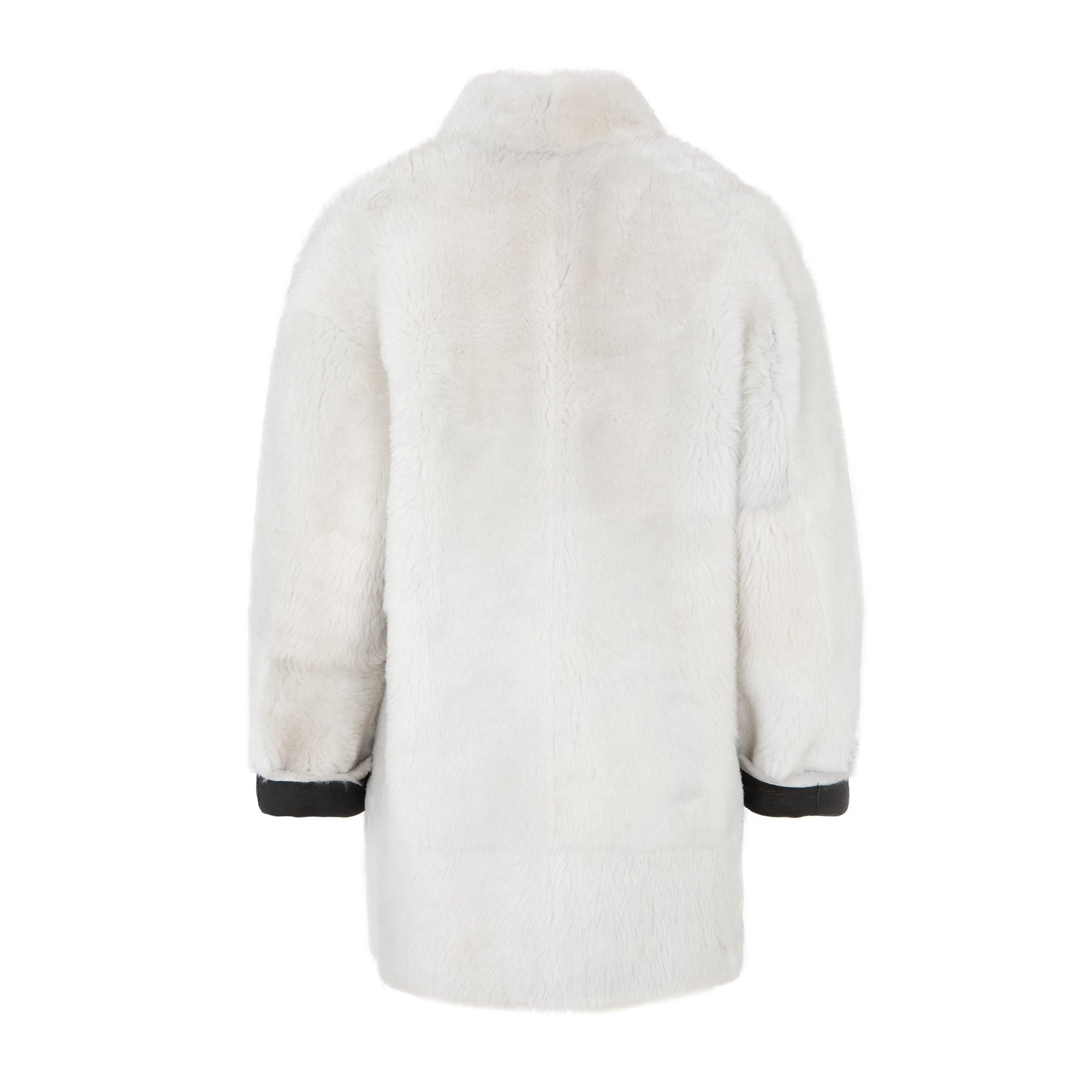 Chaquetón de piel de cordero español con pelo rizado y acabado en napa. Manga tres cuartos, cuello tortuga, reversible y color negro con detalle tira de grossgrain en plateado . Bolsillos laterales y cierre con botón clip de carey. 100% Cordero español. Fabricado en España. Tallaje español.
