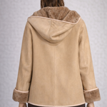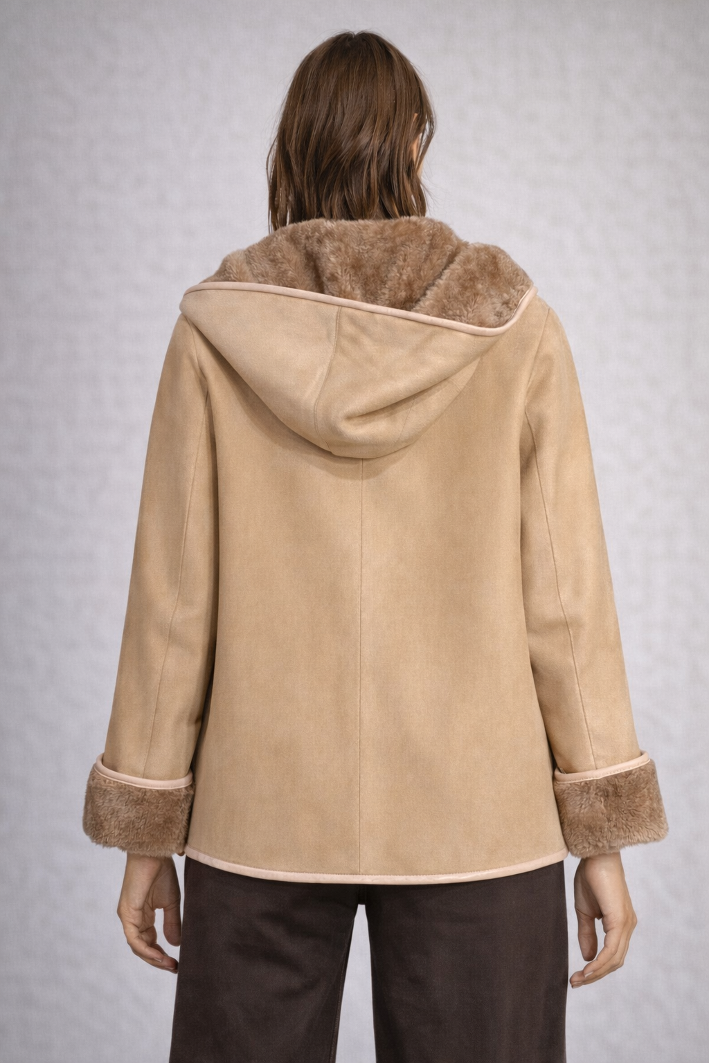 Chaquetón reversible , ante/ pelo, de cordero español. Piel ligera y flexible. Patrón con capucha , cruzado y ribeteado en cuero al tono .Cierre con trabilla de cuero con automáticos y bolsillos con cremallera. Color : arena . Composición: 100% cordero español . Hecho en España .